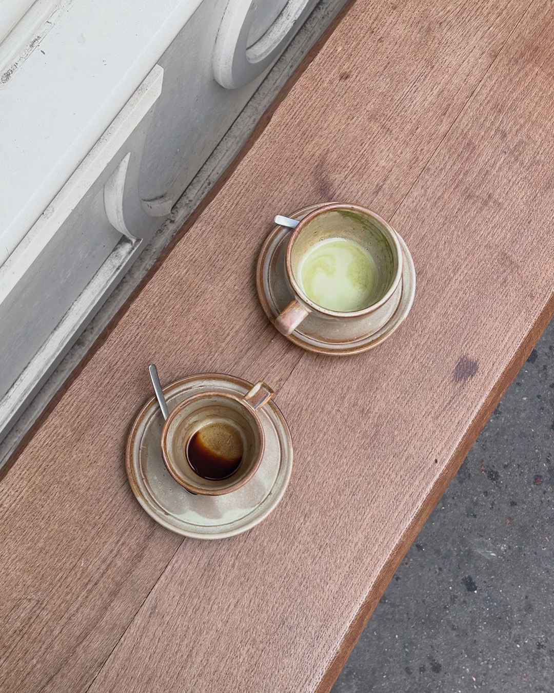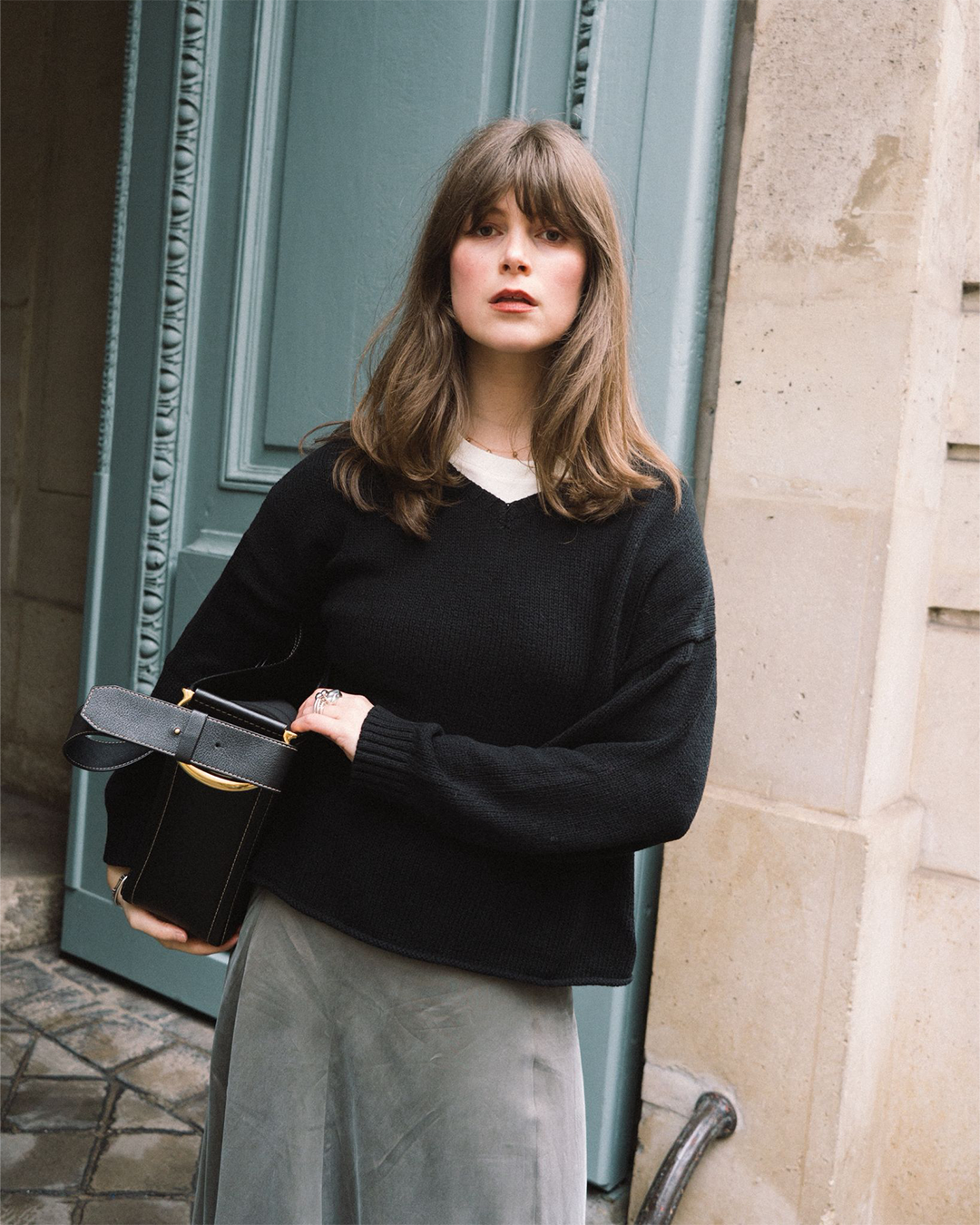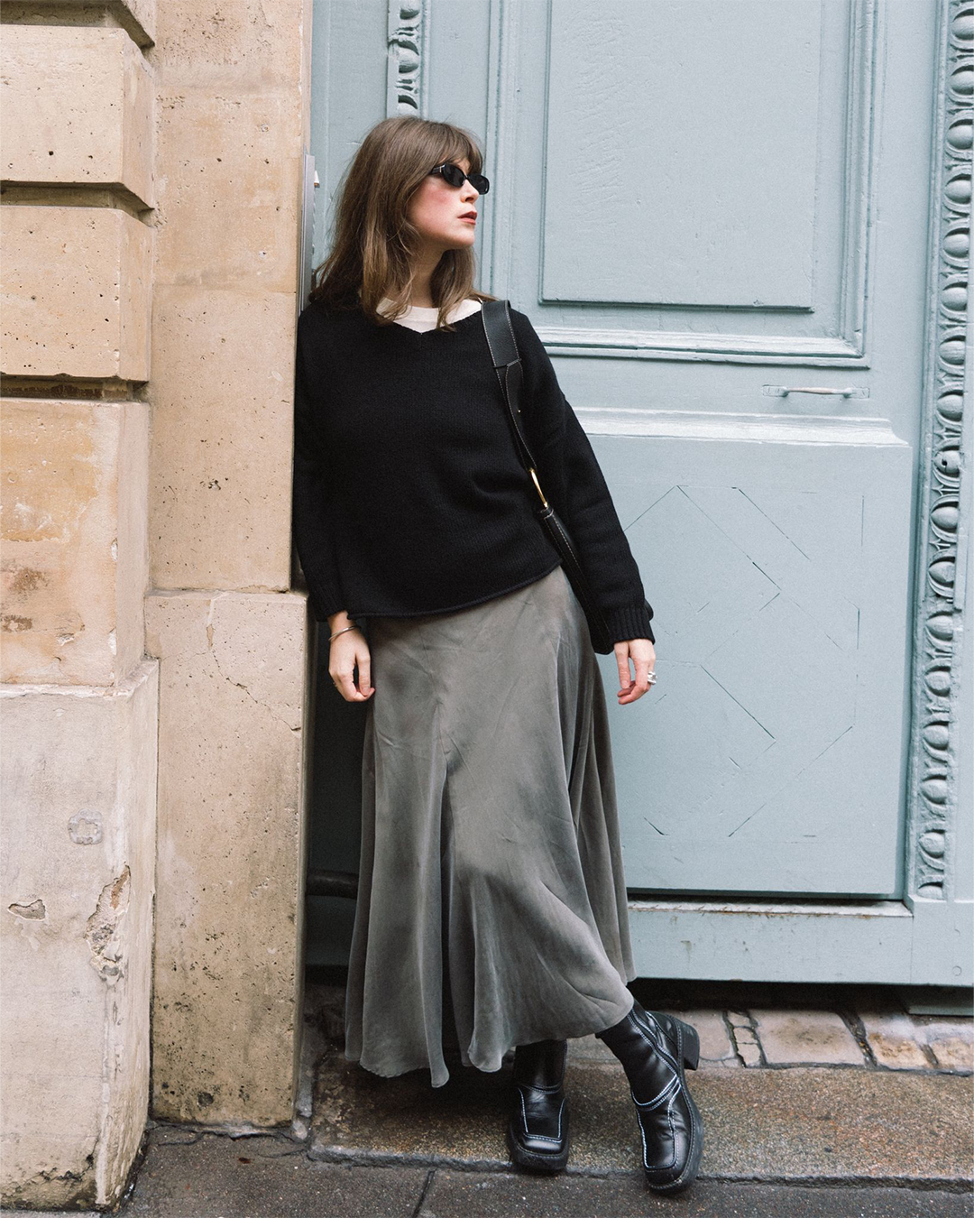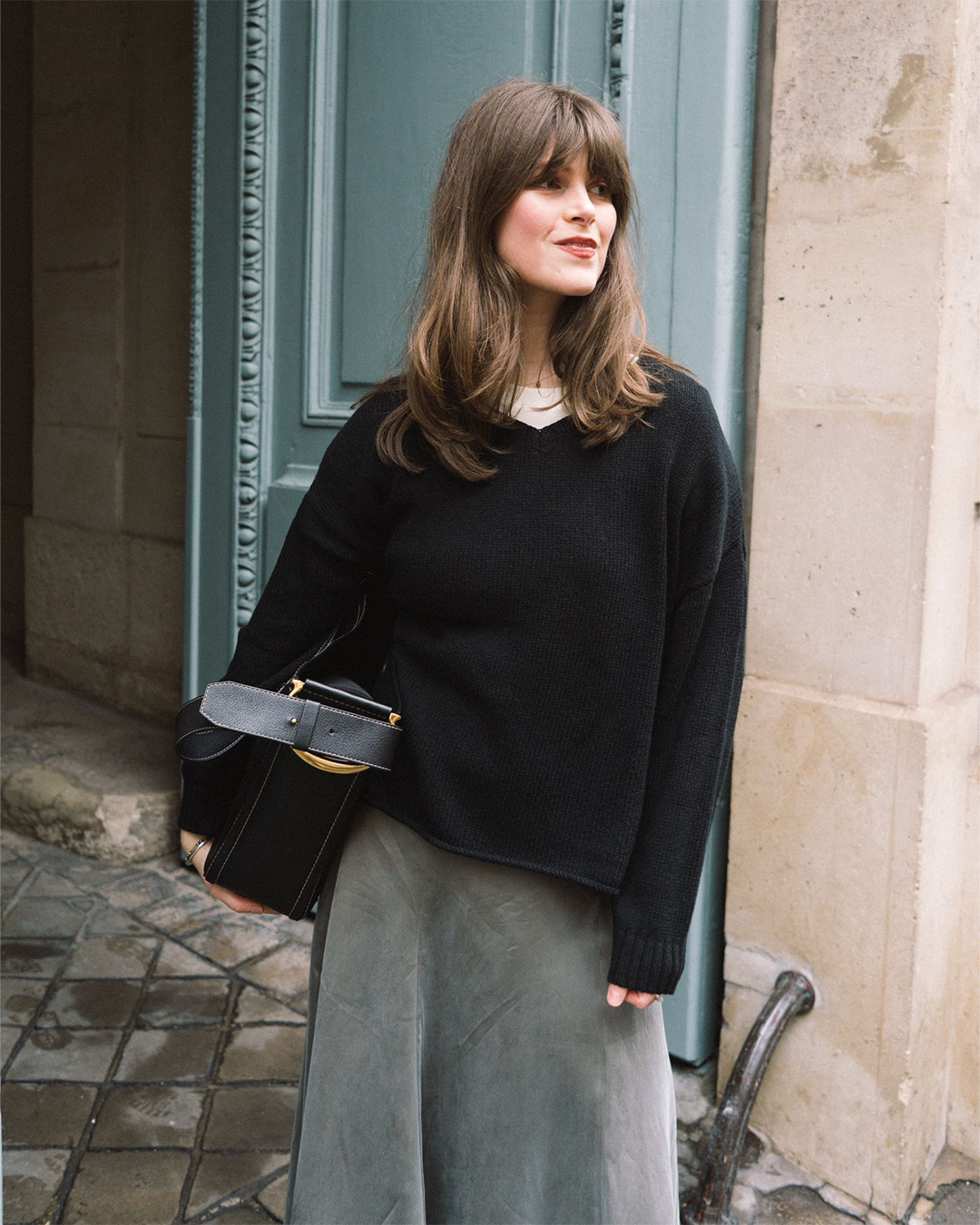 Michelle is wearing a size M for Porter Tee and Palais Skirt and size L for Cove Jumper.