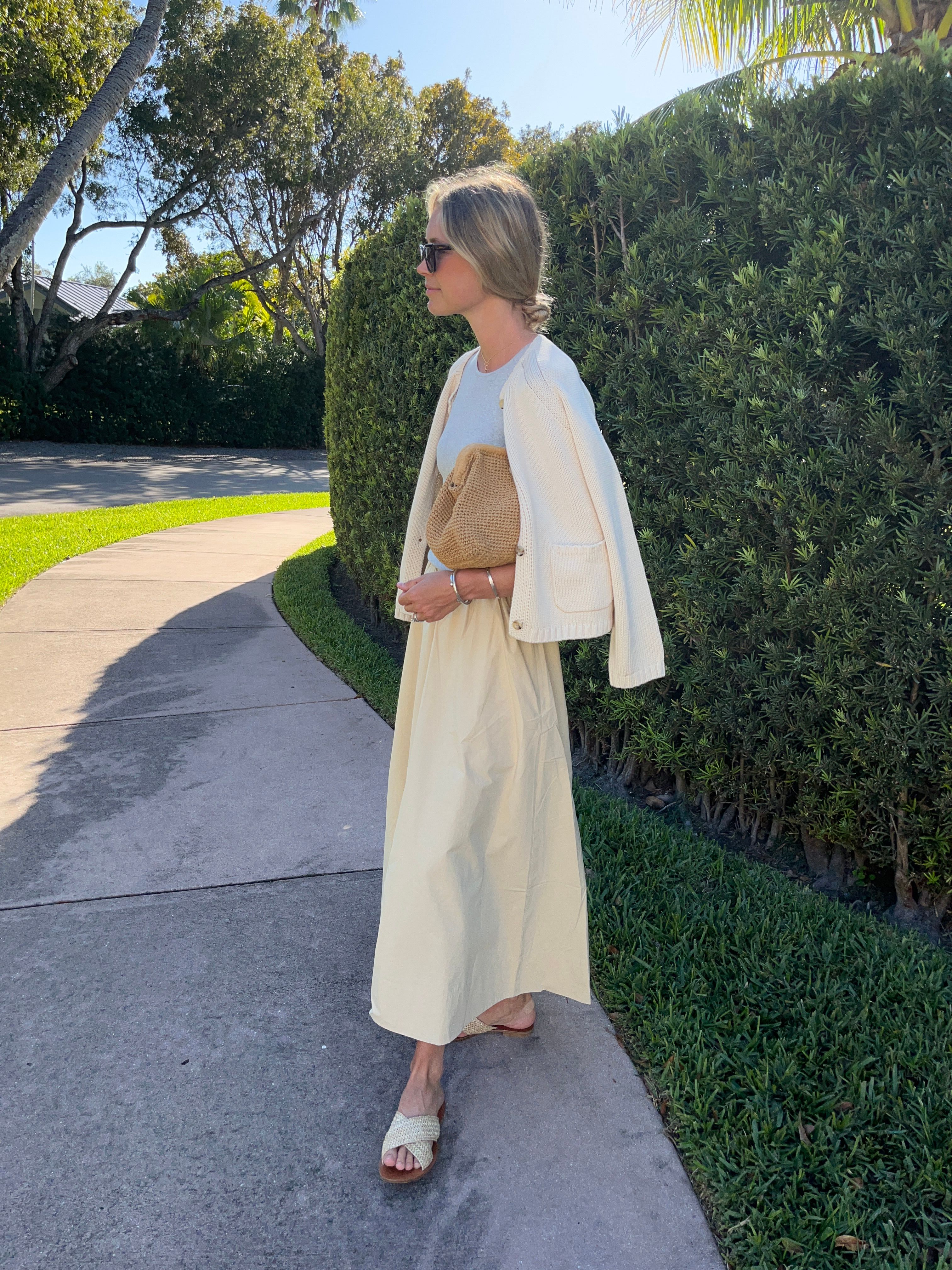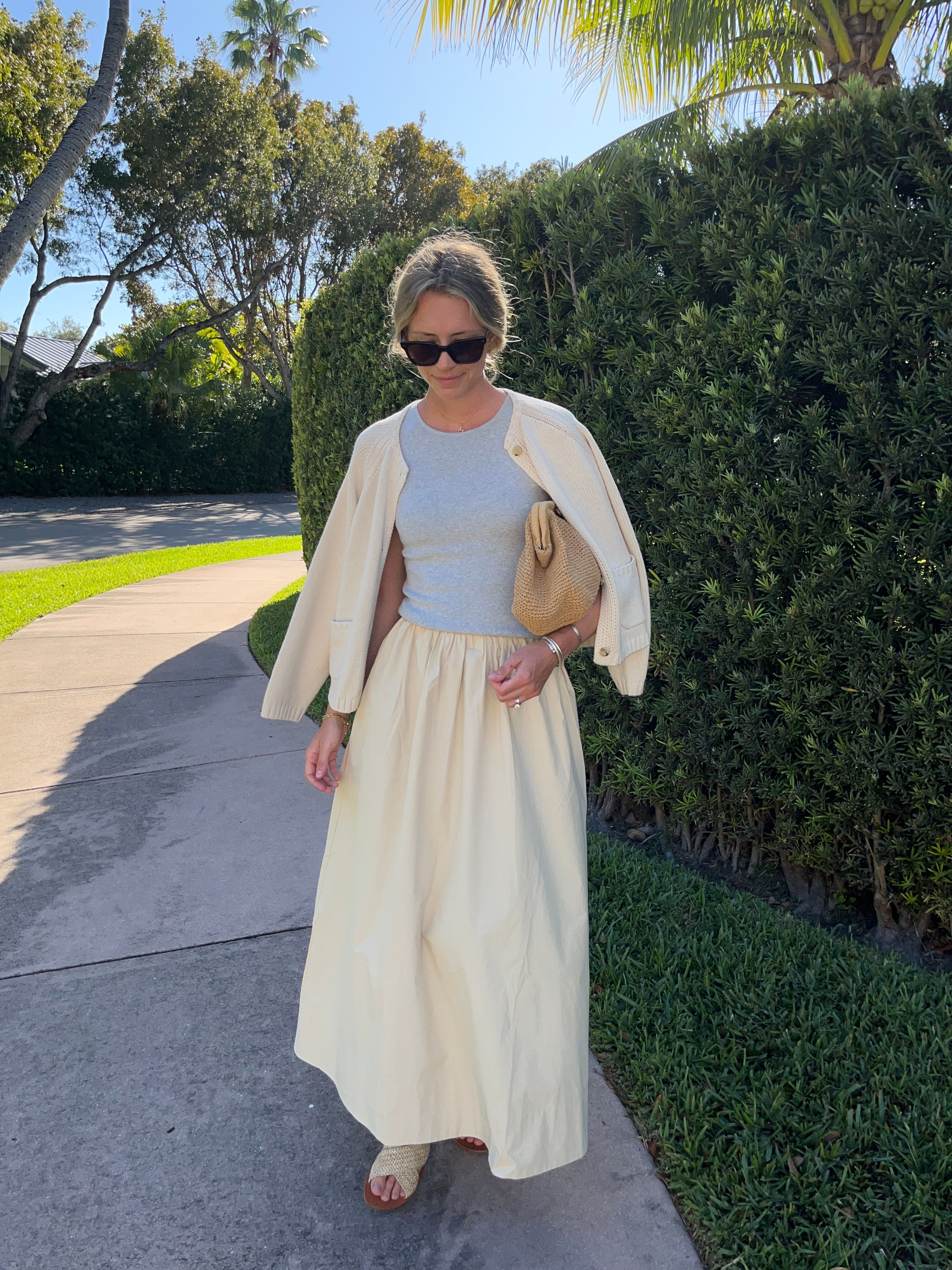Maddie wears a size S for Garden Skirt and Cove Cardigan, and size XS for Park Tank.