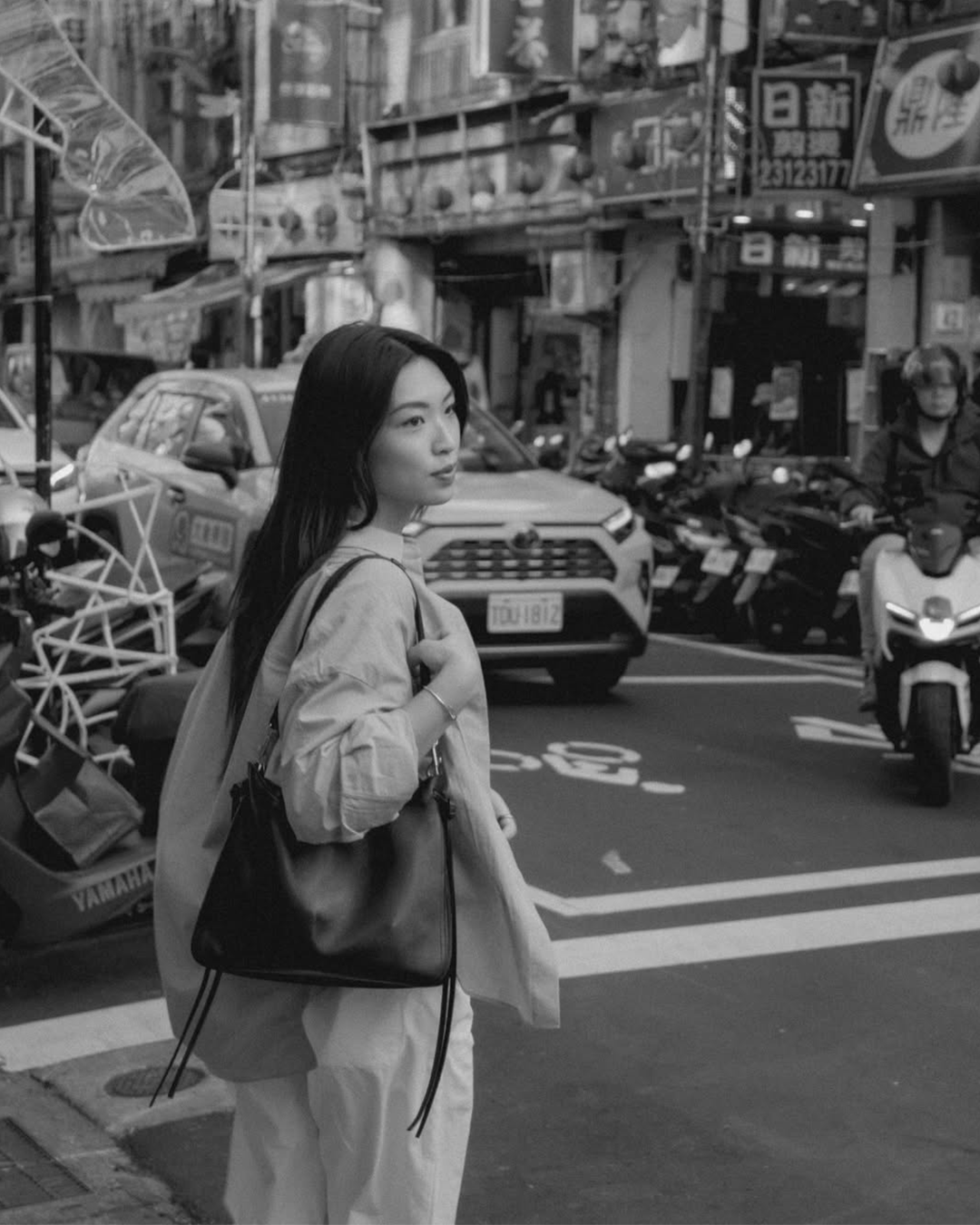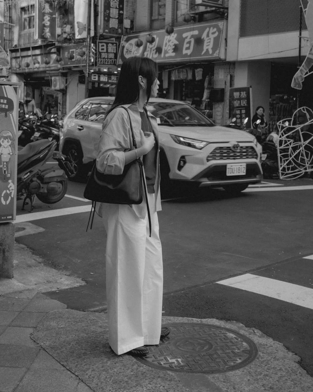 Michelle is 170cm and is wearing a size M for Studio Shirt and Sailor Slacks.