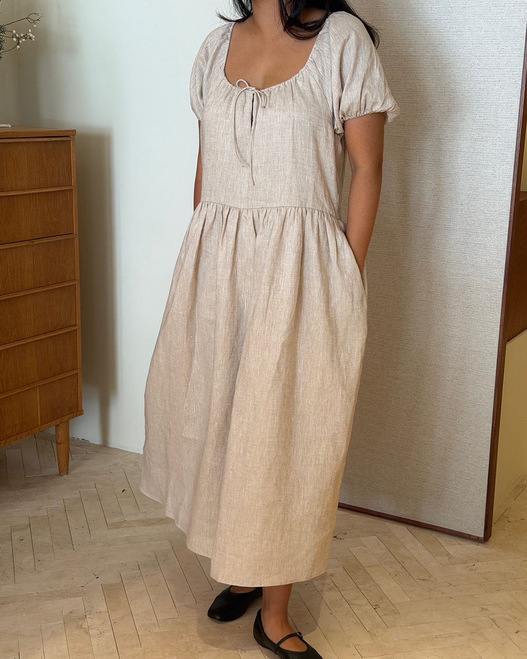 S-T-H Amelie Dress in pure Linen. Designed for an easy fit with gathers at the waist and a tonal tie front ribbon. Features an elasticised neckline and sleeve cuffs, and made complete with two discreet side pockets.