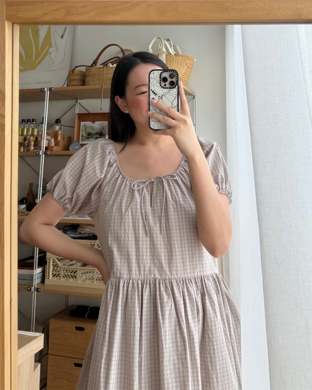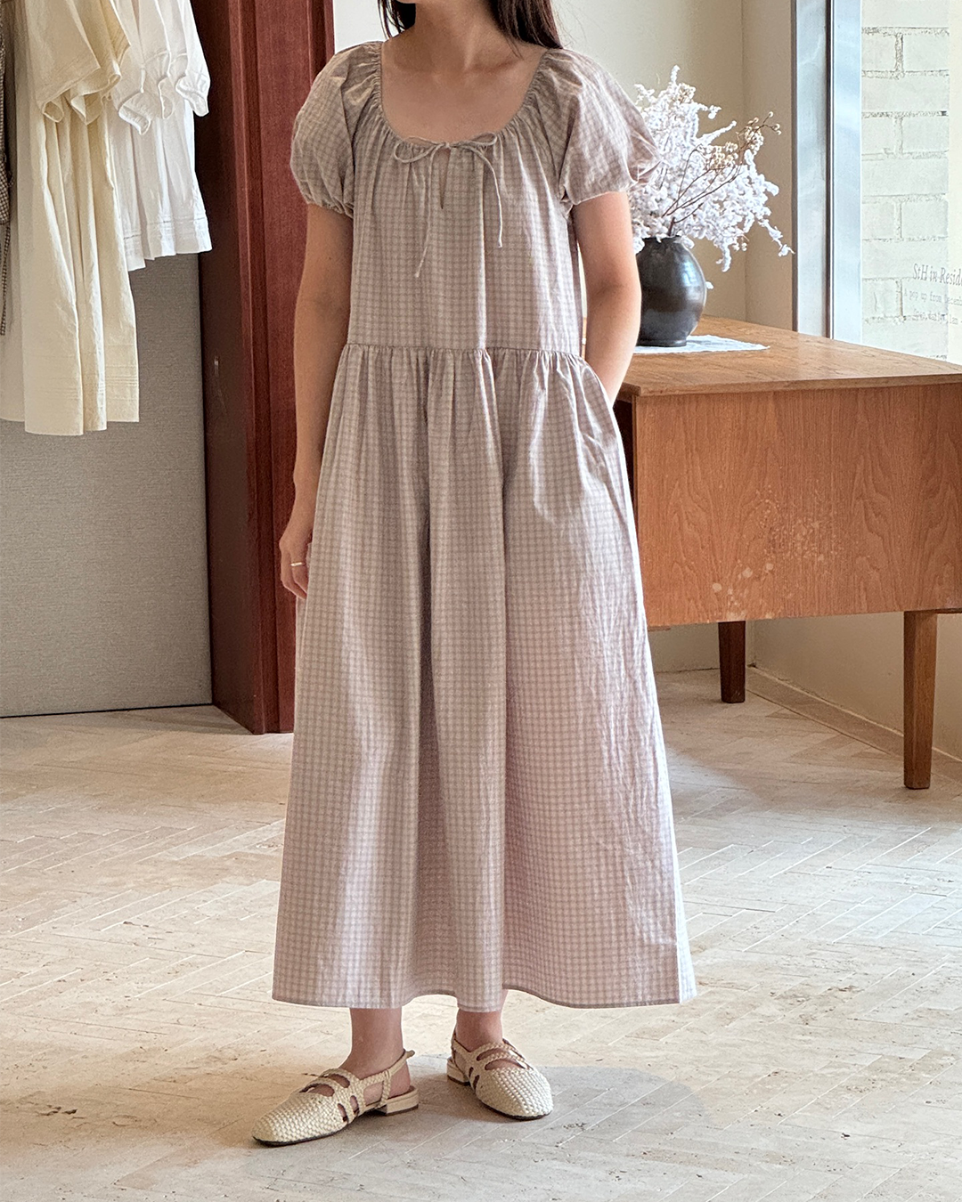 S-T-H Amelie Dress in Organic Cotton. Designed for an easy fit with gathers at the waist and a tonal tie front ribbon. Features an elasticised neckline and sleeve cuffs, and made complete with two discreet side pockets.
