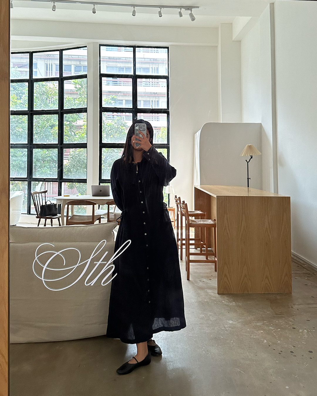 S-T-H Beth Dress in 100% Oeko-Tex Tumbled Linen from France. Shaped to an A-line silhouette with an elastic gathered waist across the back and an adjustable sash at both sides to cinch or tie across the waist for added definition. Made with a rounded neckline, gathered back details and dark shell buttons down the front.