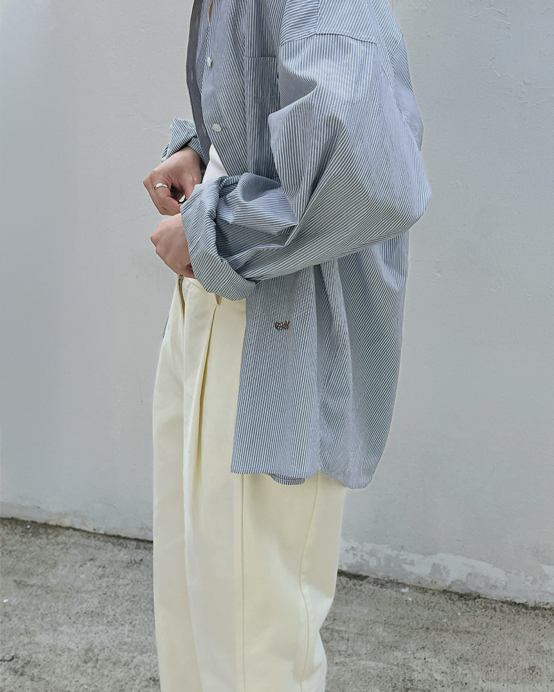 S-T-H Bistro Shirt in Striped Cotton from Japan. A tailored shirt designed for an oversized fit, with a chest pocket and lustrous pearl buttons down the front. Made with cuffed long sleeves and complete with 'Sth' logo embroidery for a finishing touch. A staple in the StH wardrobe.