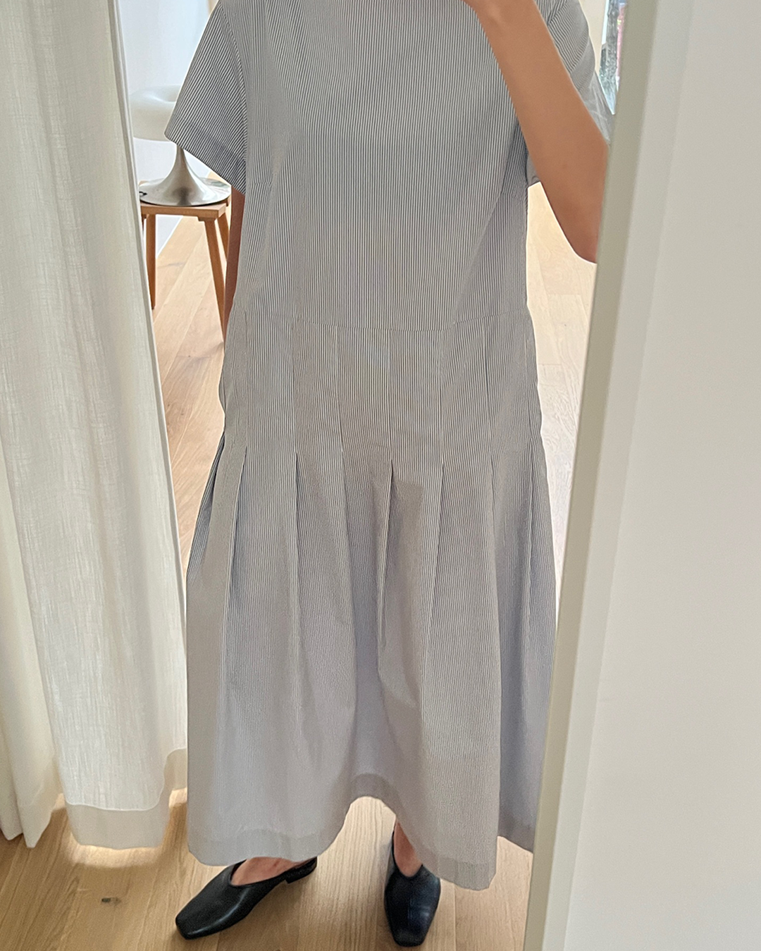 S-T-H Boathouse Dress in Japanese Cotton. Designed for a straight fit with a wide boat neckline, dropwaist tailored pleats, and two discreet side pockets. Wear it with flats and a belt for daytime ease and slip into heels come evening.