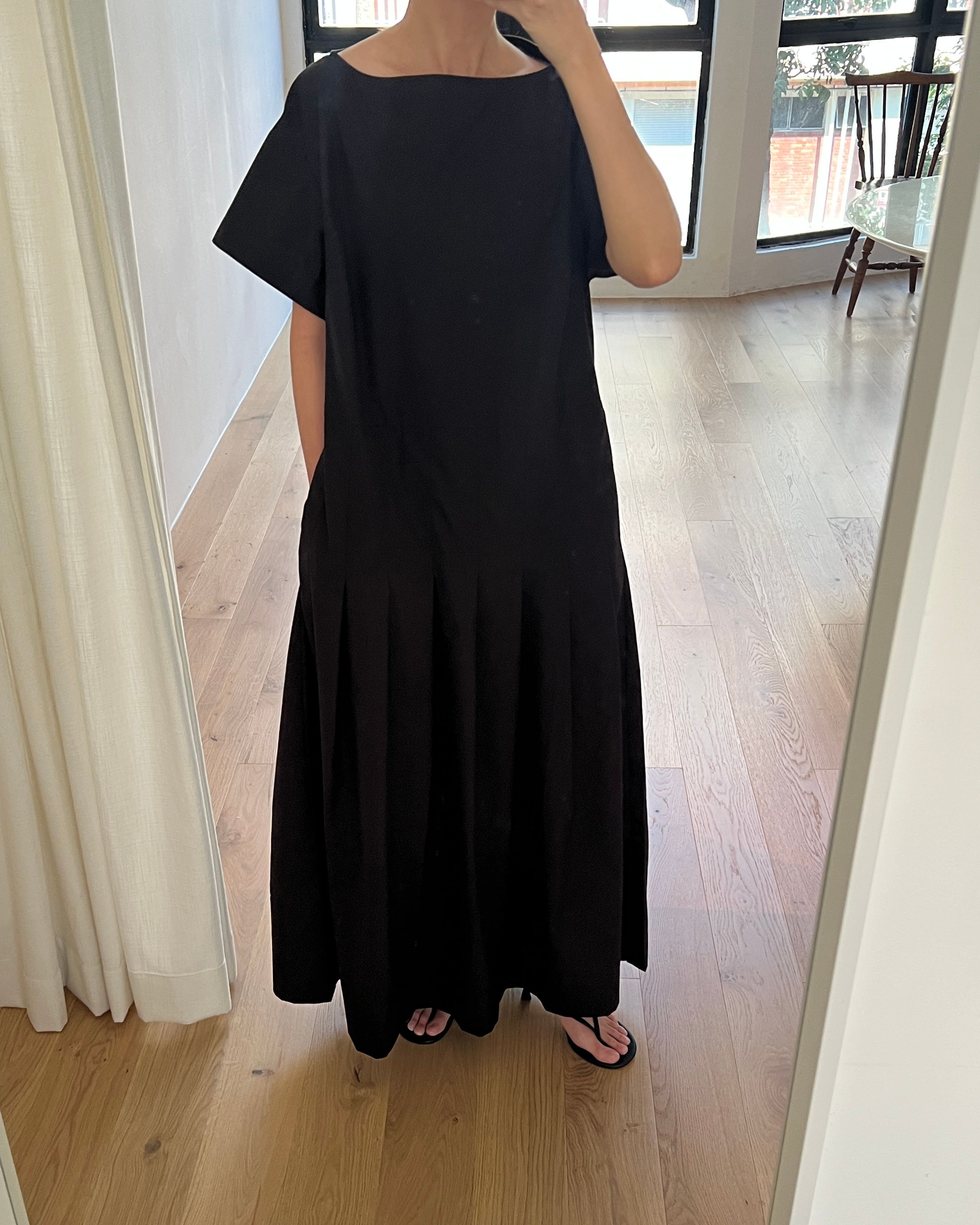 S-T-H Boathouse Dress in Organic Cotton. Designed for a straight fit with a wide boat neckline, dropwaist tailored pleats, and two discreet side pockets. Wear it with flats and a belt for daytime ease and slip into heels come evening.