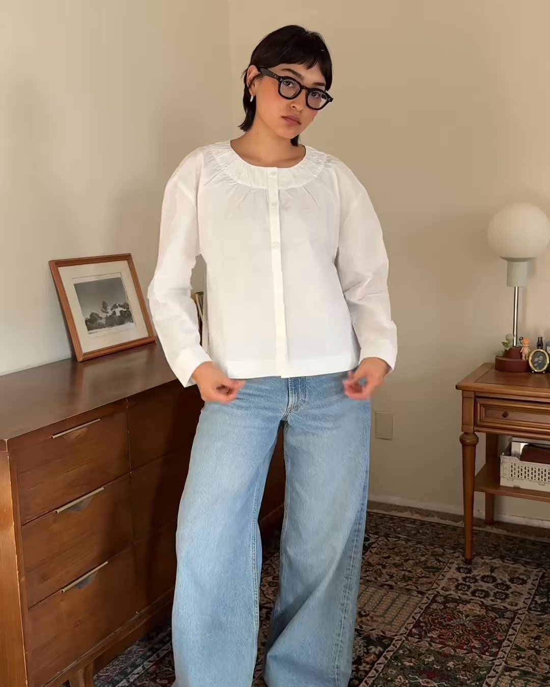 S-T-H Brioche Blouse in lightweight Organic Cotton. Designed for a relaxed fit with gathers around a curved yoke, functional buttons down the front and an adjustable sleeve cuff. Wear buttoned up with Isle Trousers for an elevated look in the city.
