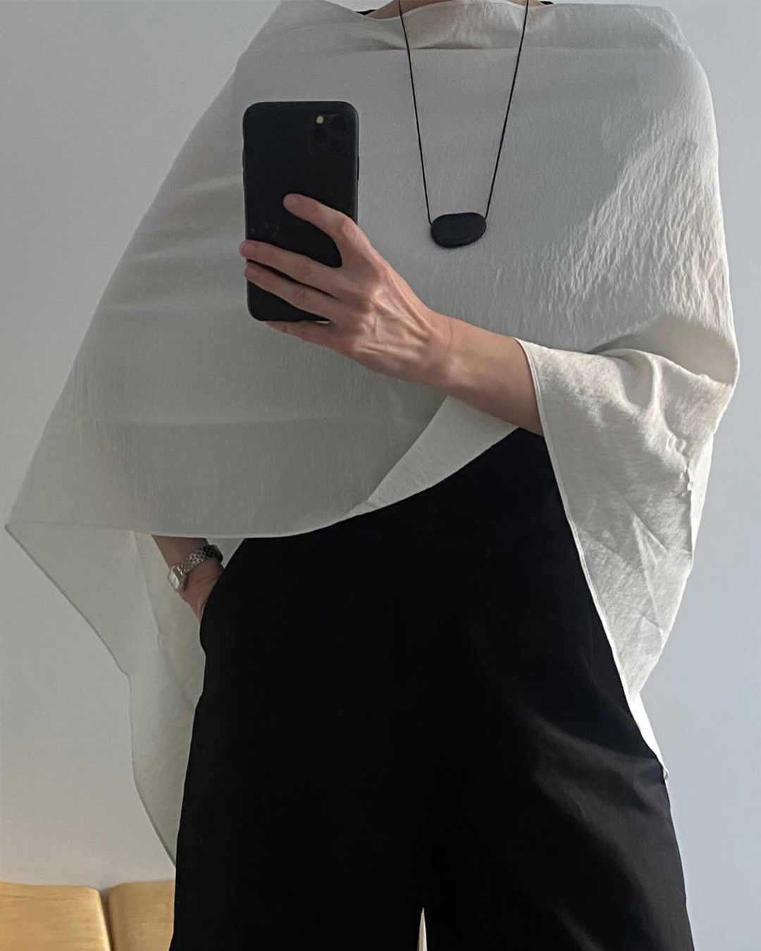 S-T-H Columne Scarf crafted from feather-light Italian Air Modal that offers subtle surface texture for rich visual detail, and has a graceful drape that lends softness to the modern wardrobe. A versatile statement piece that invites the wearer to explore endless ways to style it draped down the back, around the neck or over one shoulder. Made generously wide with a striking length and features a small mother-of-pearl button for discreet fastening and tonal logo embroidery.
