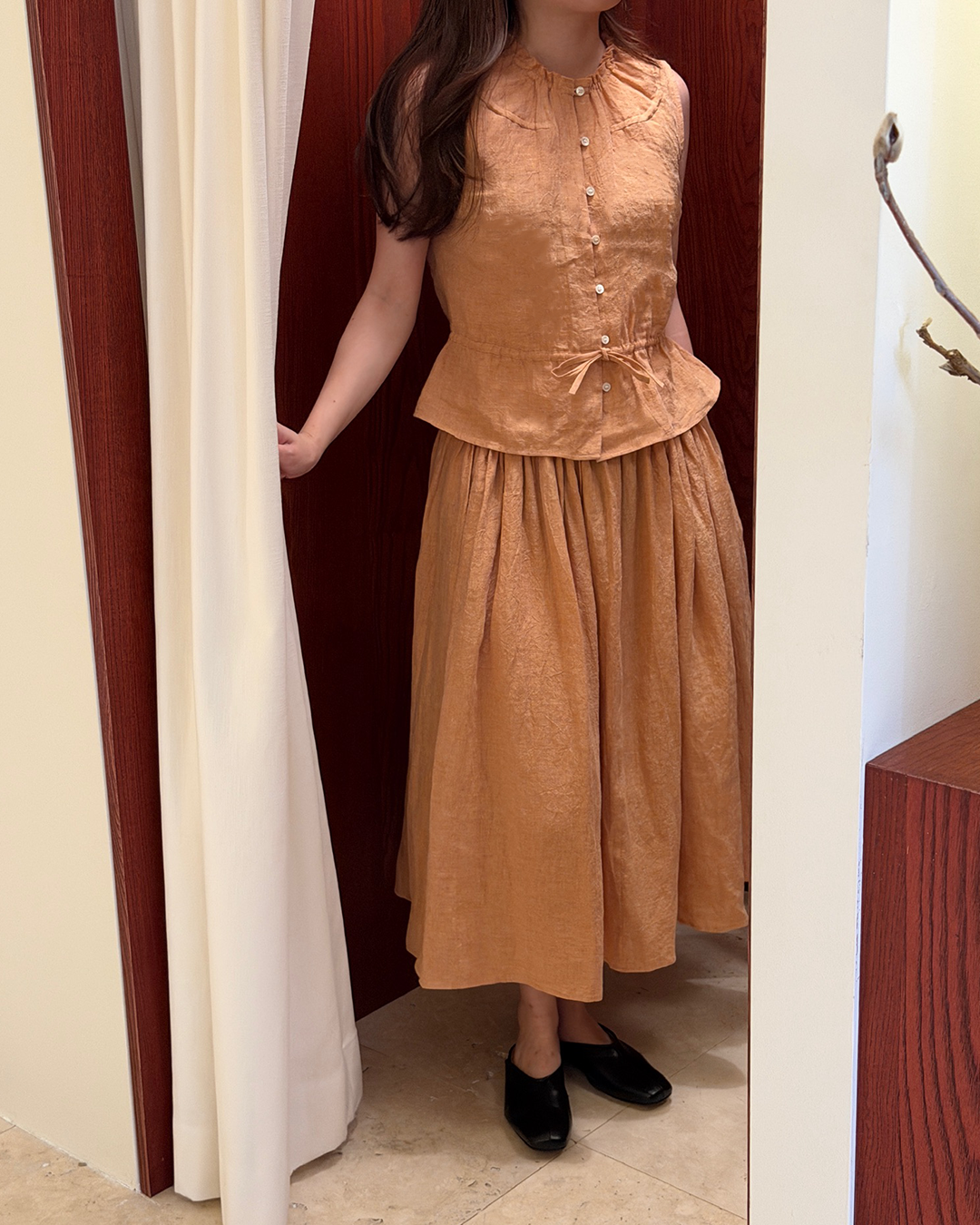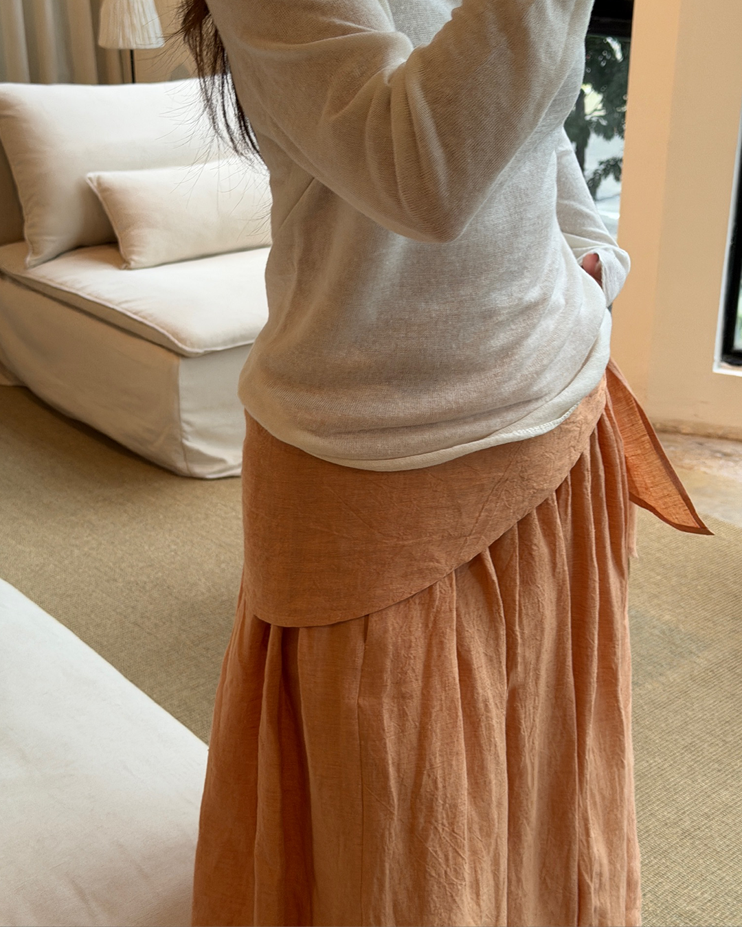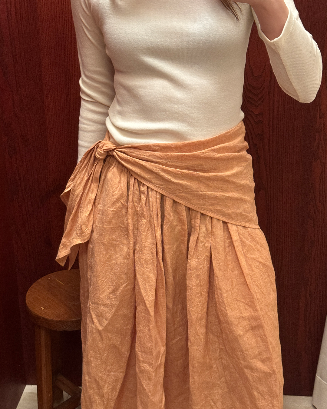 S-T-H Ellis Skirt in pure Linen. Designed for a fun fit with a comfortable elasticised waistband, and cut to a vintage length that ends just below the knee. Comes with a detachable wrap that can be tied in a double knot to the side for added flair. Wear with Grove Top for an StH linen look.