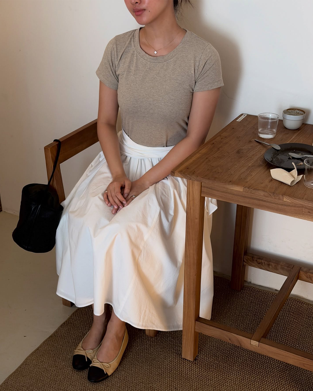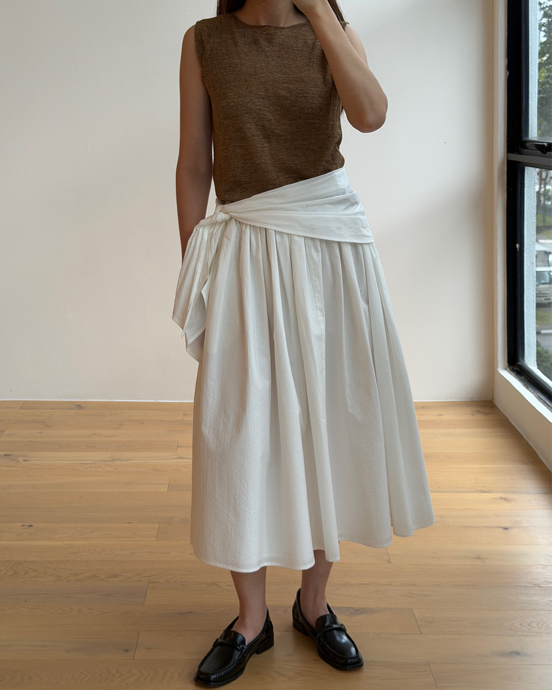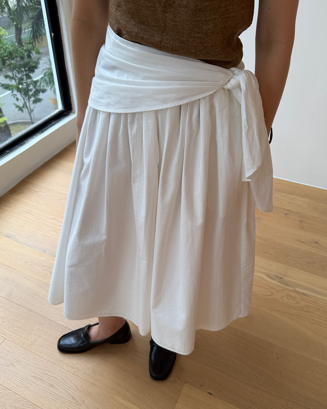 S-T-H Ellis Skirt in textured Organic Cotton. Designed for a fun fit with a comfortable elasticised waistband, and cut to a vintage length that ends just below the knee. Comes with a detachable wrap that can be tied in a double knot to the side for added flair.