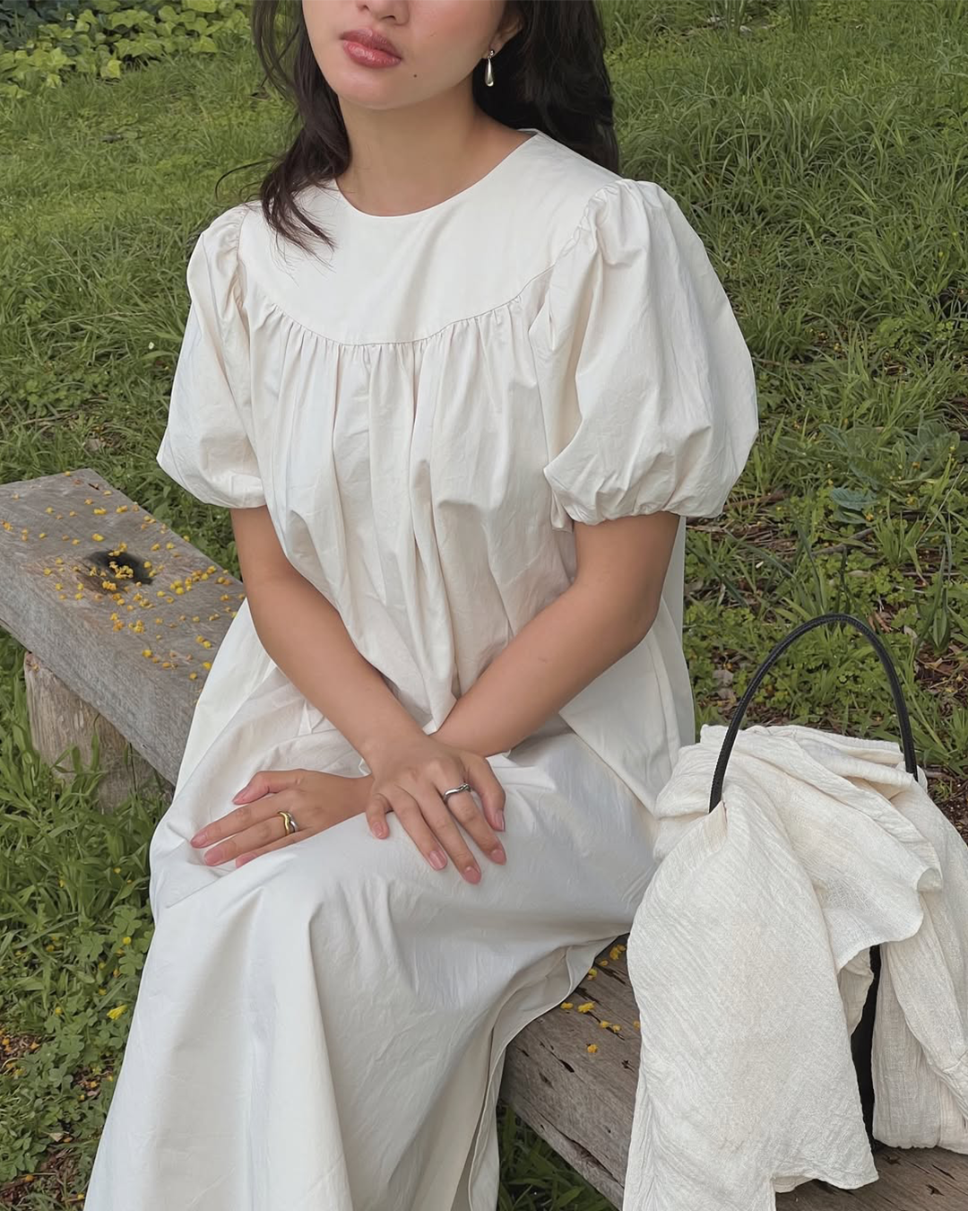 S-T-H Garden Dress in textured Organic Cotton. Designed for an A-line fit with an elasticised sleeve hem, gathers around a curved yoke, a shell button closure, two side pockets, and a detachable waist sash.