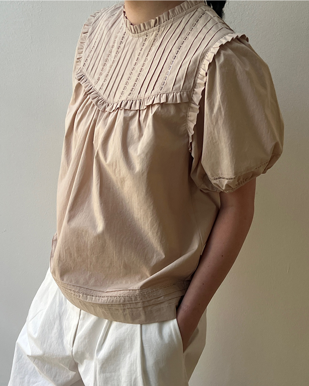 S-T-H Ilia Top in Organic Cotton. Designed for an easy fit with finely detailed lace trims and pintucks on the décolletage, and ruffles around the neckline and shoulders for a romantic touch. Features a short puff sleeve that ends with a thin elastic cuff, and a keyhole button at the nape.