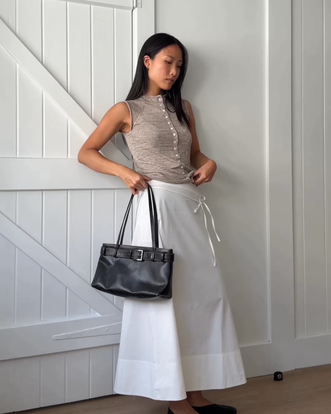 S-T-H Patio Knit Top in a lightweight Japanese Linen knit. Designed for a distinguished fit with functional shell buttons down the front, a subtle funnel neckline, and a detachable sash to lend a touch of femininity.