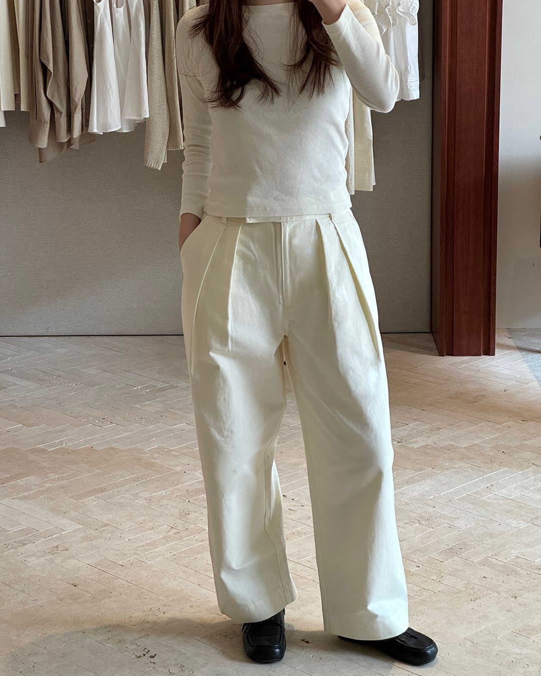 S-T-H Patio Trousers in structured Cotton twill. Designed for a straight-leg fit with double pleats on each side for a clean, tailored look. Complete with a defined waistband, belt loops, tonal seams, and an overlapping hook and zip front closure. Comes with two side pockets and button-flap back pockets.