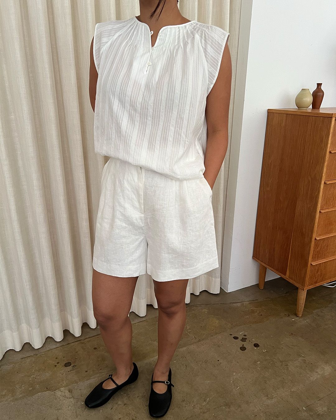 S-T-H Penne Blouse in a striped embroidered dobby cotton. Designed for a relaxed fit with pintucks around the neckline, a half placket with functional keyhole pearl buttons, and curved sides at the hem for a special touch. Dress it up with a Slip Skirt or wear with Studio Trousers to go about your day.