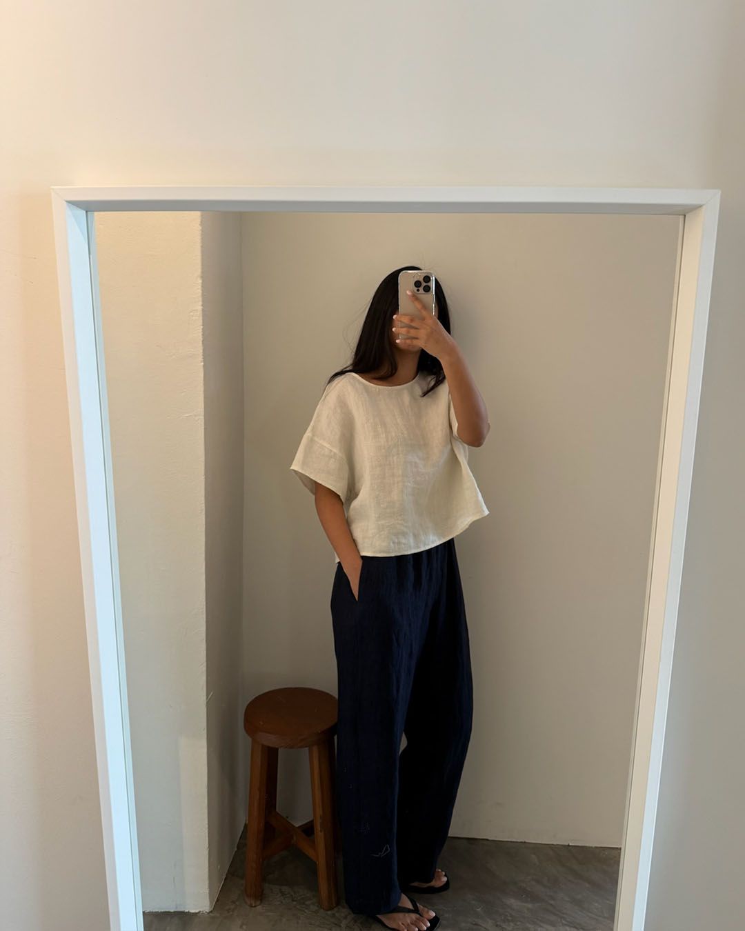S-T-H Potter Slacks in Tumbled French Linen. Designed for a comfortable lounge fit with an elasticised waist all around and shaped to a straight leg silhouette. Comes with two side pockets. Size down up to 2 sizes if you prefer a shorter length and slimmer fit.