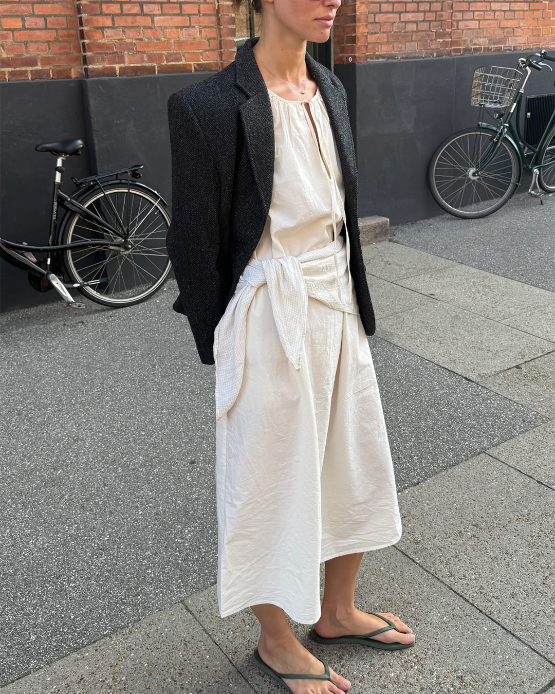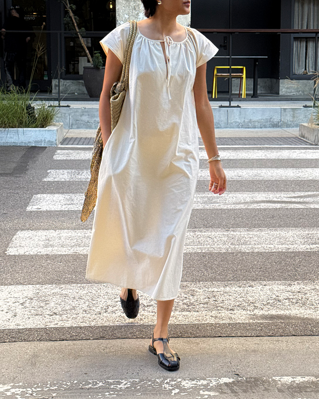 S-T-H Rowe Dress in a smooth Organic Cotton from Japan. Designed with gentle gathers, tie front ribbon and two side pockets, and shaped to a slight flare silhouette.