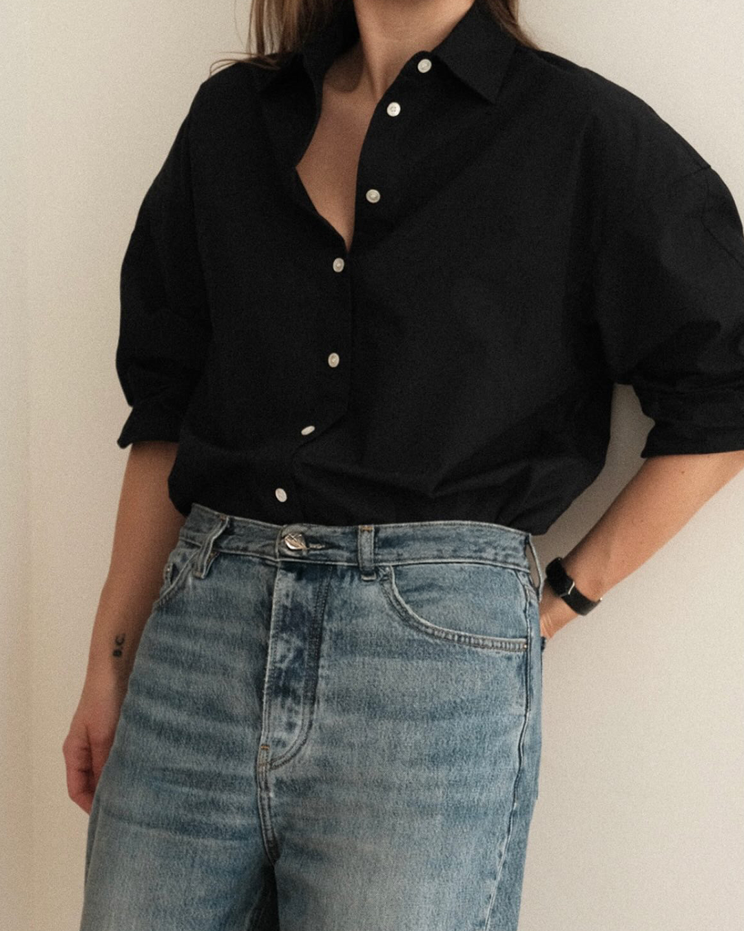 S-T-H Studio Shirt in a woven Japanese organic cotton. A delightfully oversized shirt, designed for a softly structured fit, finished with lustrous pearl buttons down the front. A signature piece and an all time favourite.