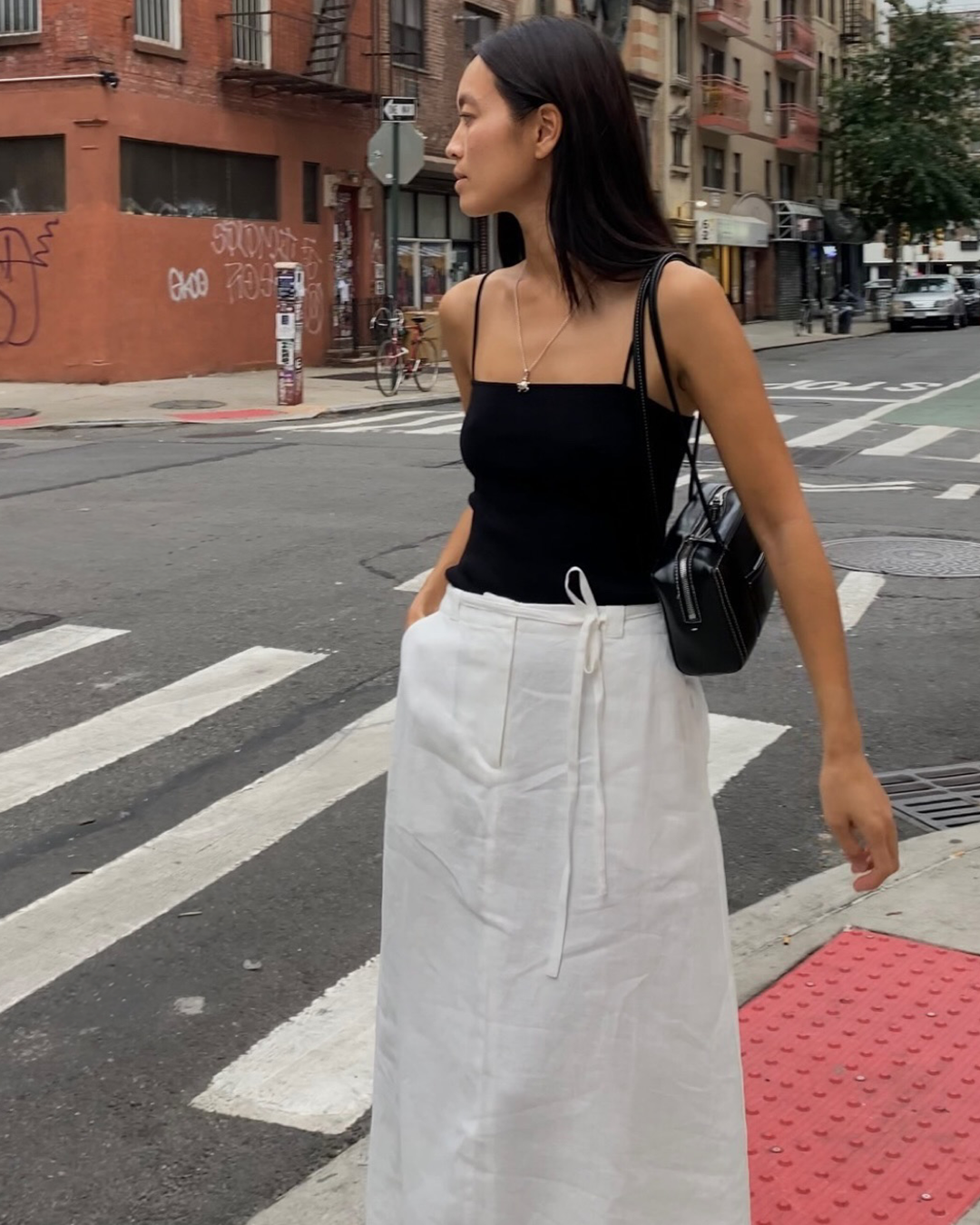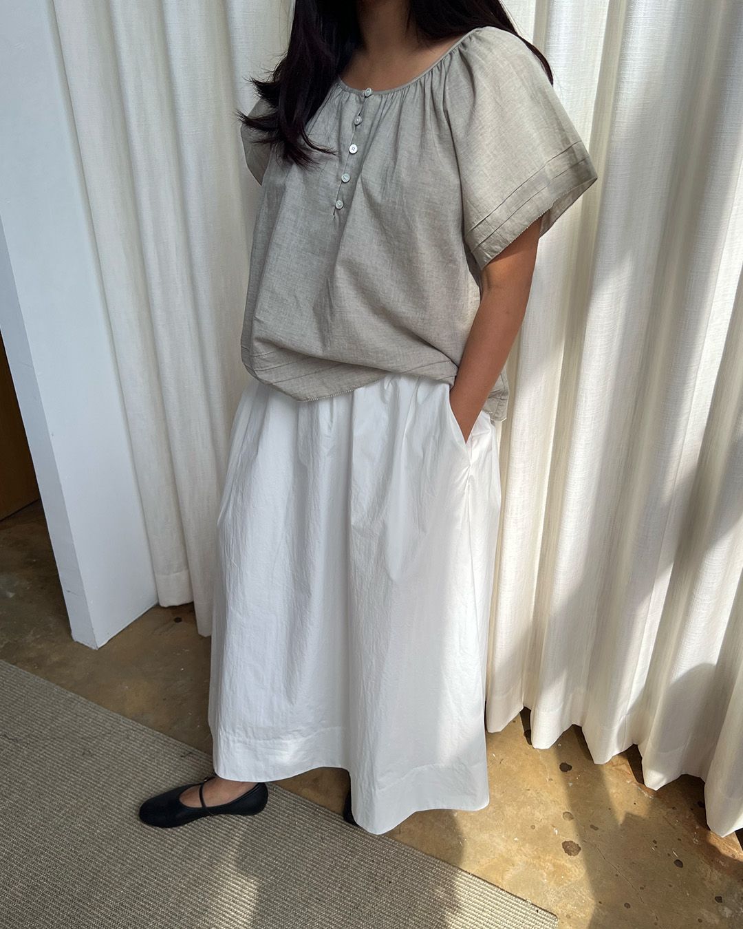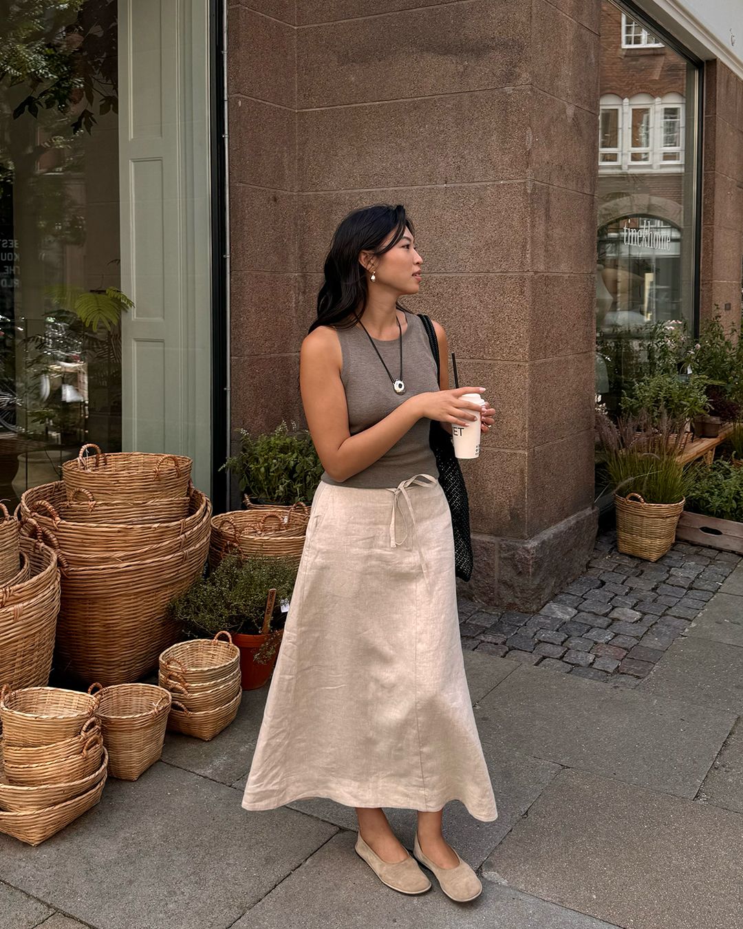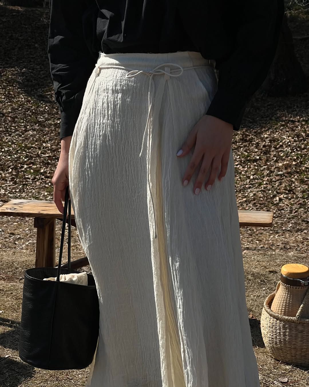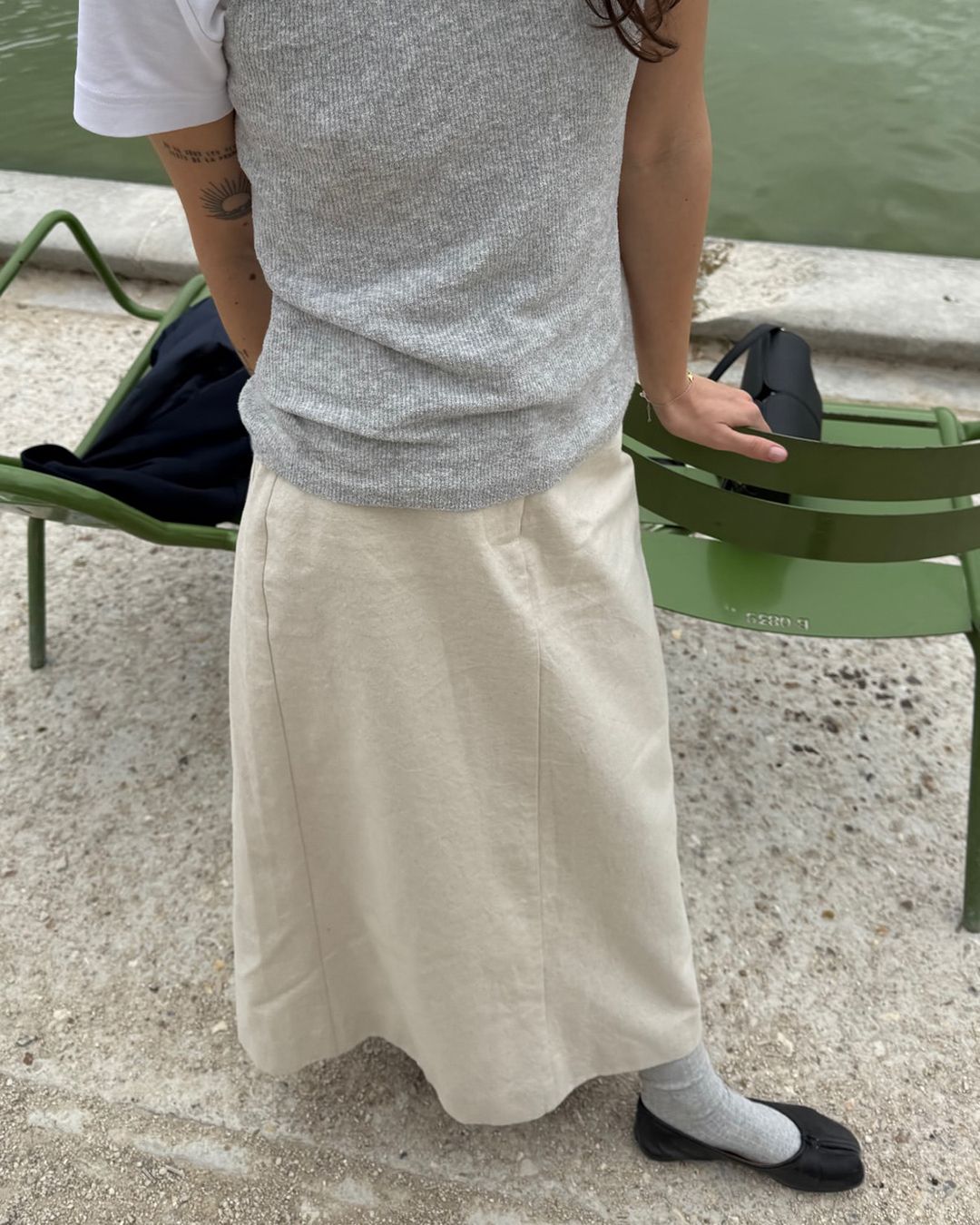 The graceful flow and movement of this skirt is second to none. It follows you so elegantly as you walk! The crinkled linen texture is gorgeous and I live for details like these.
