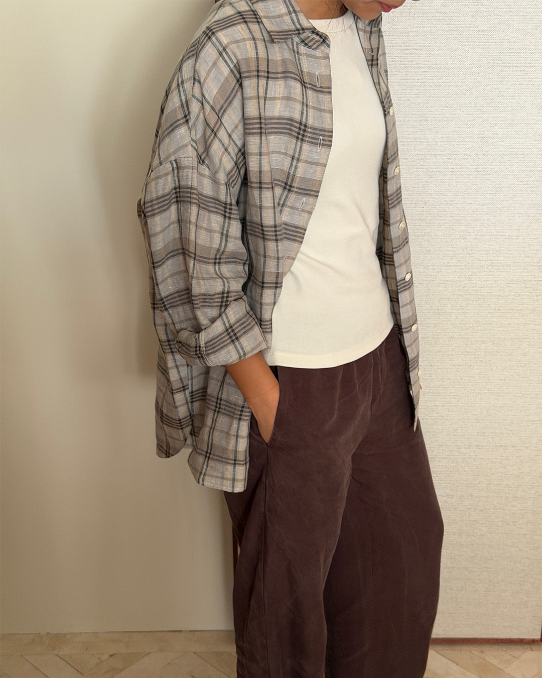 This Suzette Shirt is such a lovely layering piece. Love the rounded collar and boxy fit that just drapes so nicely because of the Tencel fabric.