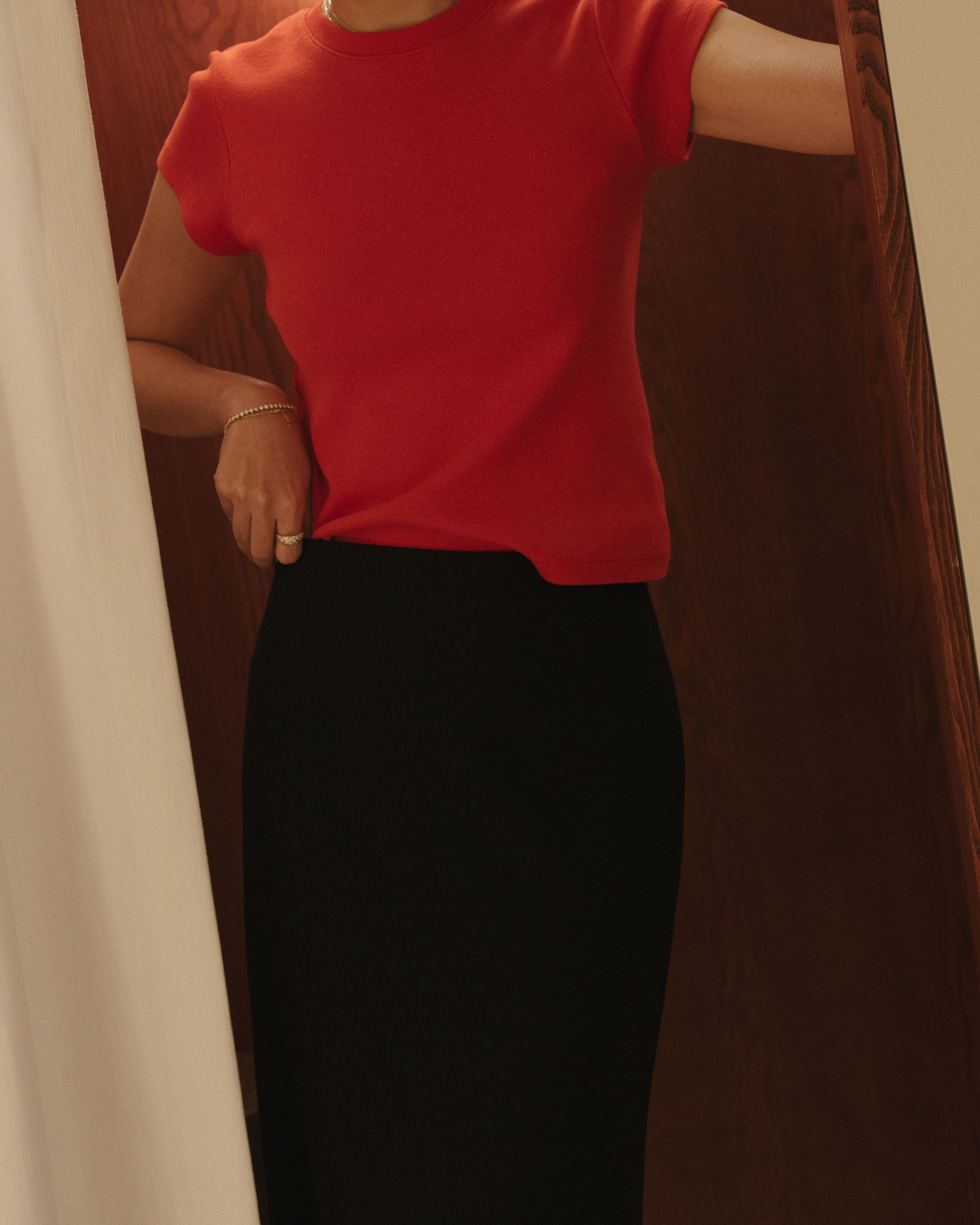 Hi Something to Hold team! Received my parcel on Saturday and just wanted to say that the Knit Tee in S fits me perfectly. Love that it's also lightweight and not too body hugging, plus it's of a good enough length to be tucked in over any bottoms. Have been searching for a longer length knit tee in a time where cropped knits are a trend. Super tempted to get the other colours too now.
