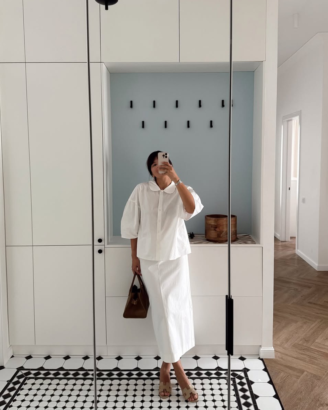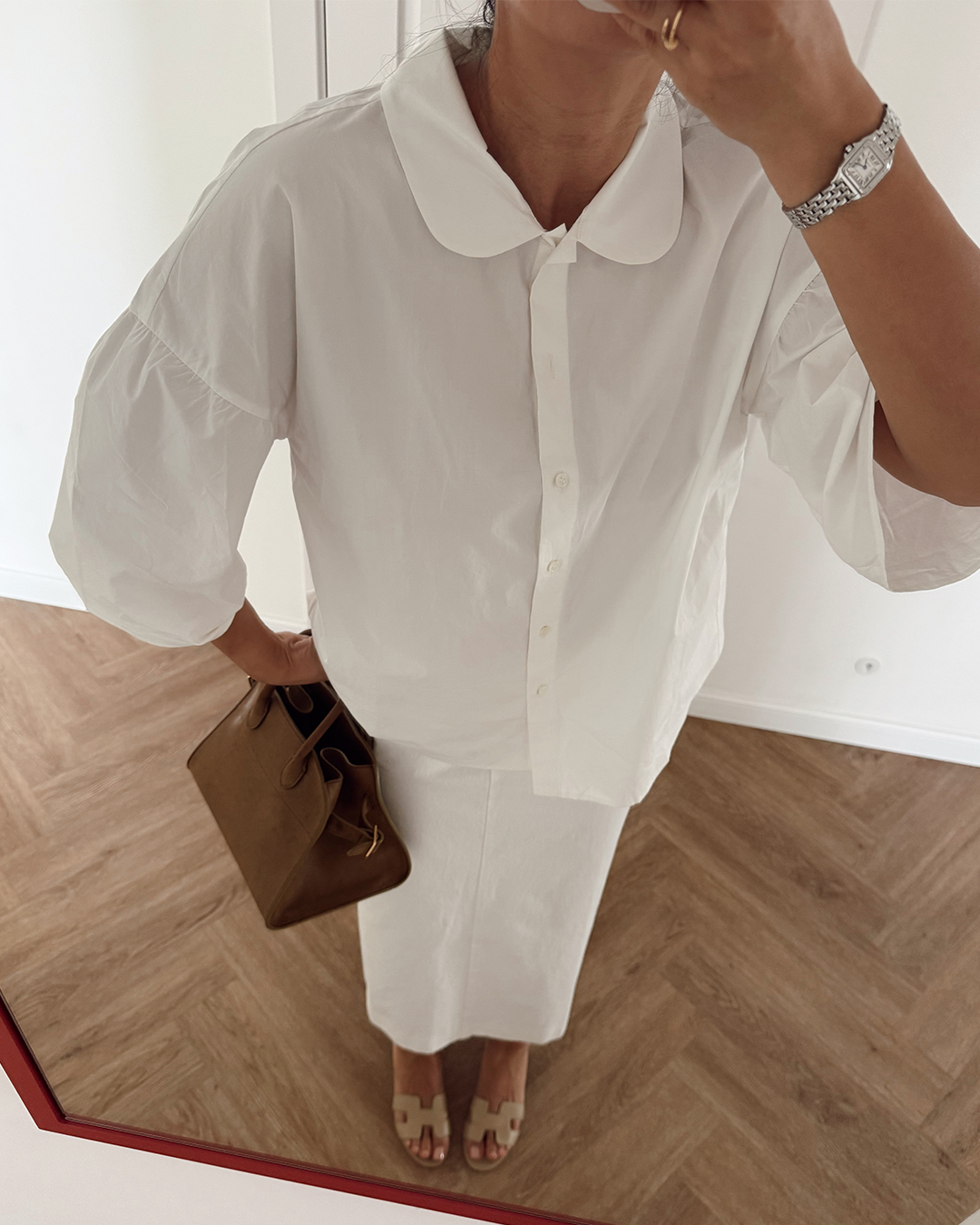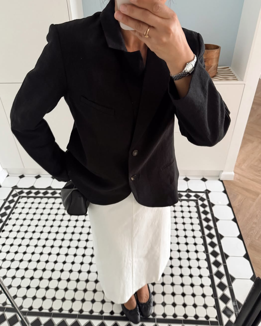 Akerke wears size M for City Blazer and Suzette Shirt, and size S for Penny Blouse and Workshop Skirt.
