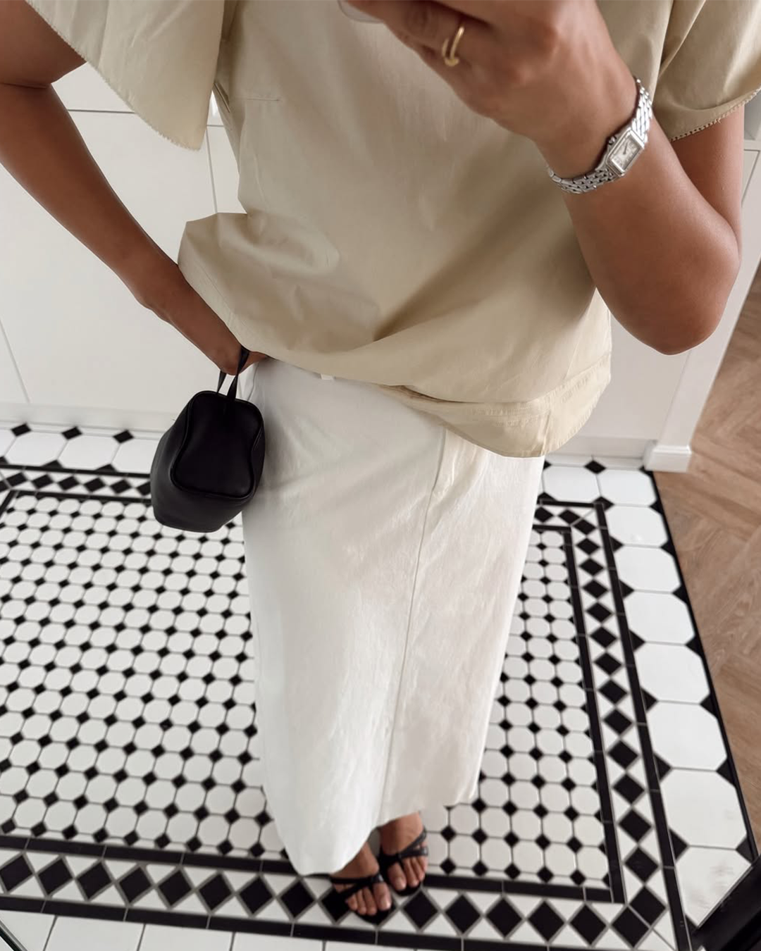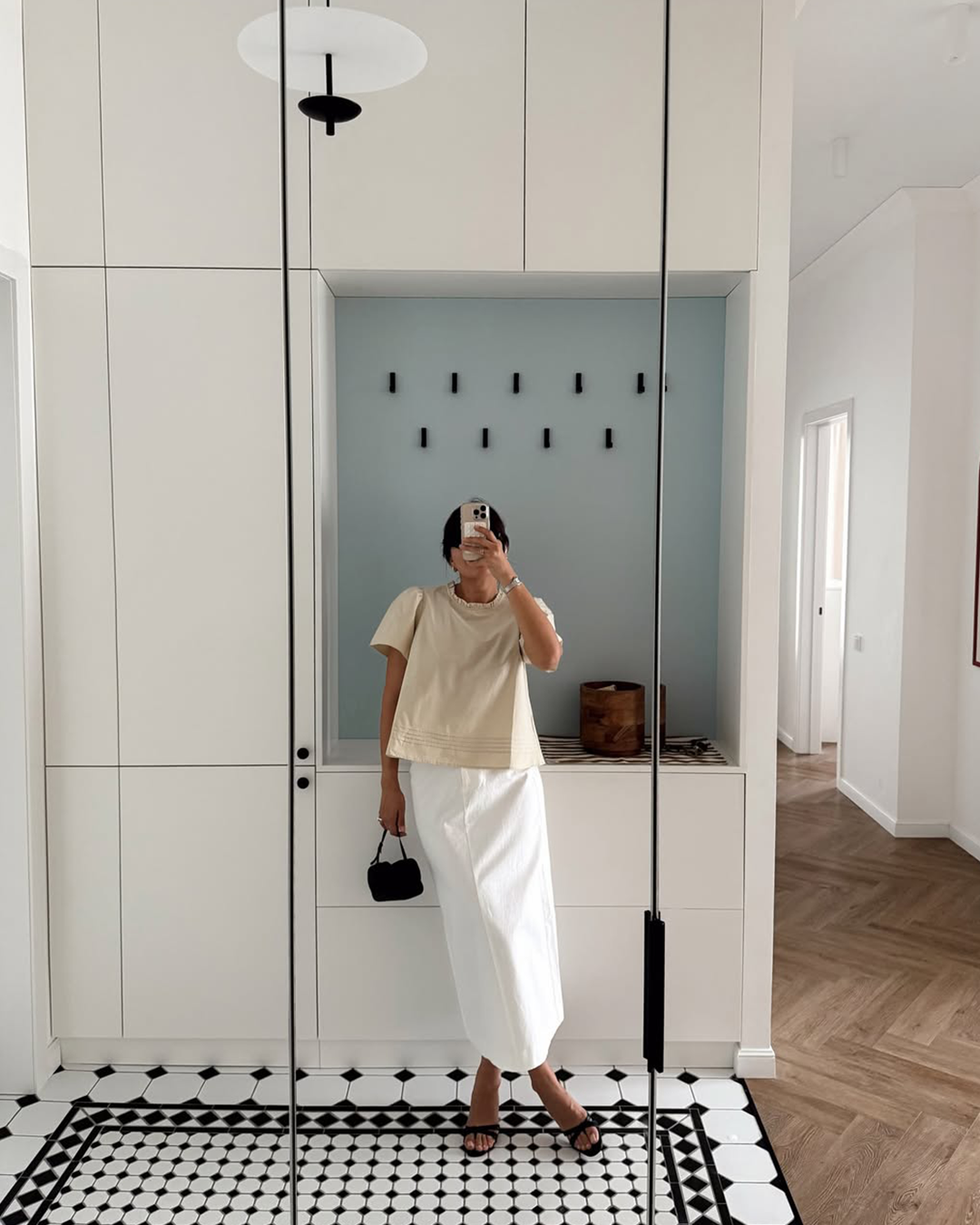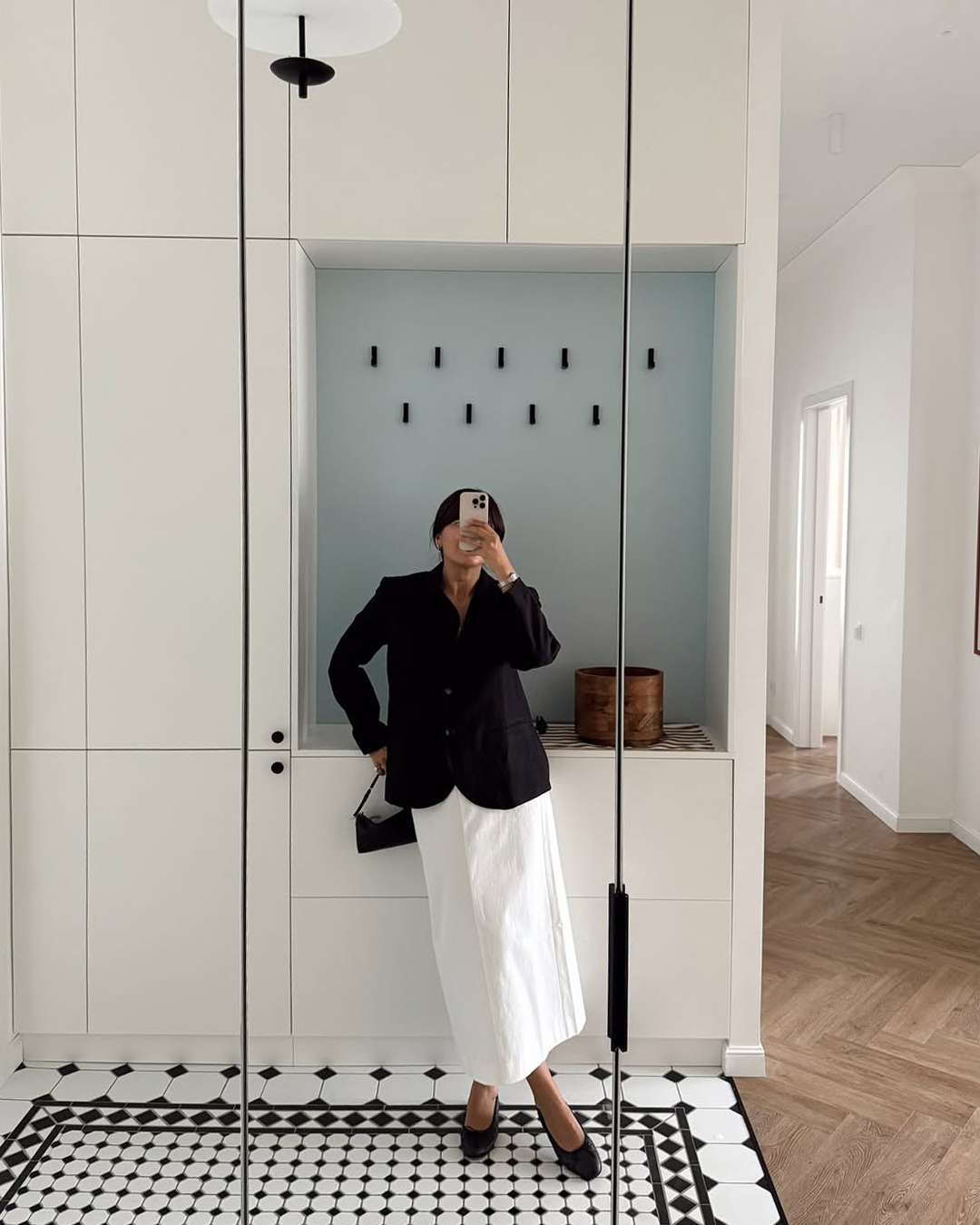 Akerke wears size M for City Blazer and Suzette Shirt, and size S for Penny Blouse and Workshop Skirt.