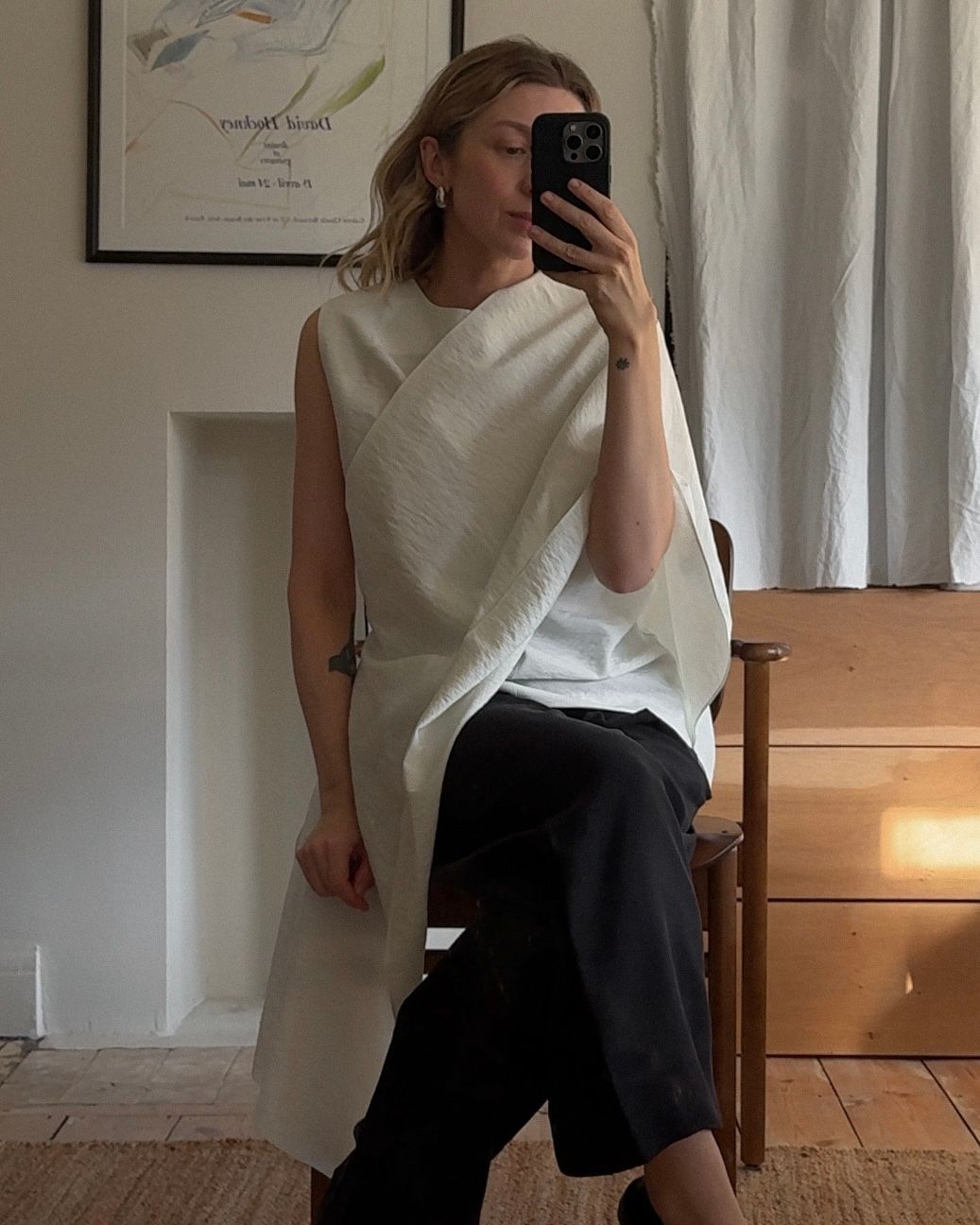 Brittany is wearing size S for Columne Top, Columne Scarf and Pilar Trousers.