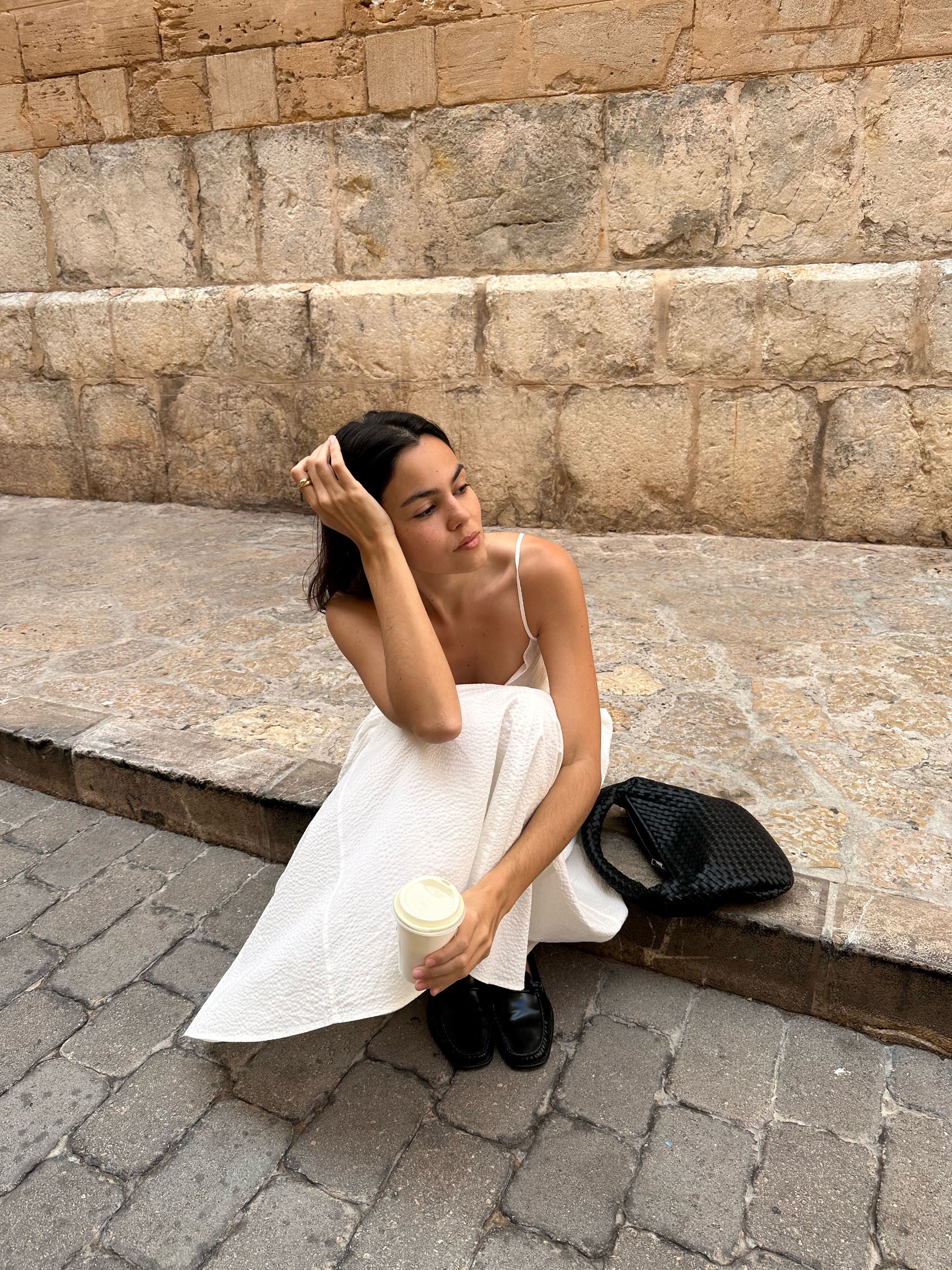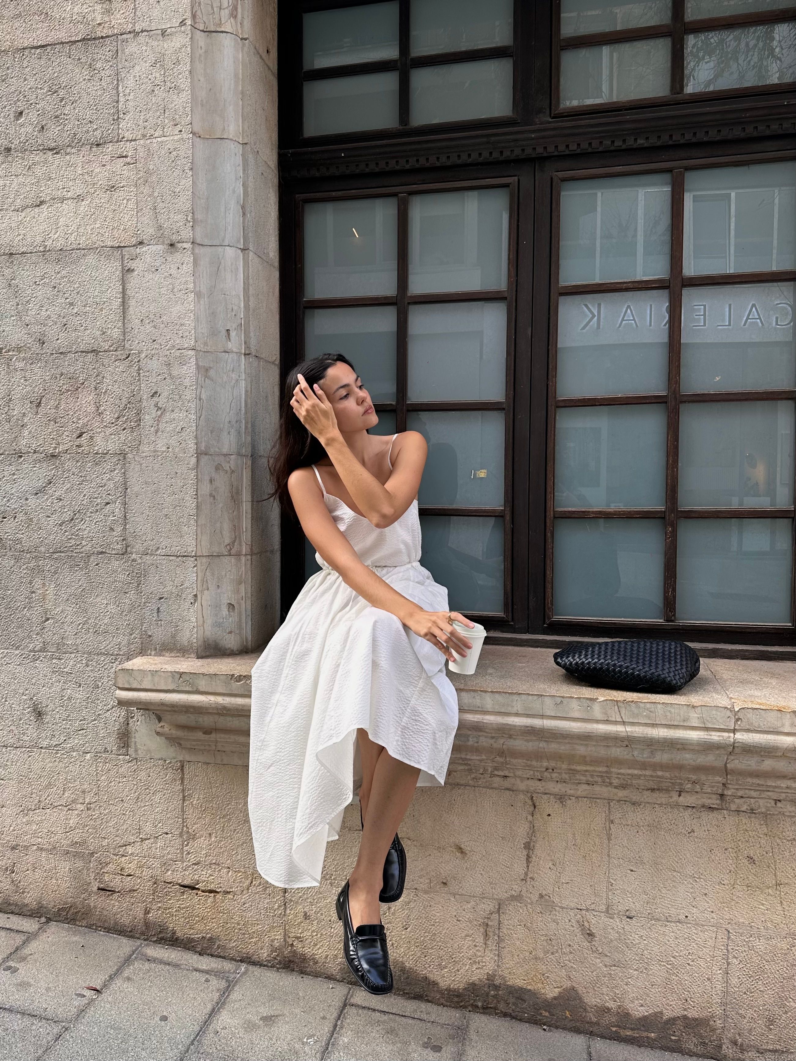 Carla is 171cm, and is wearing a size S for Bistro Dress and Library Cardigan.