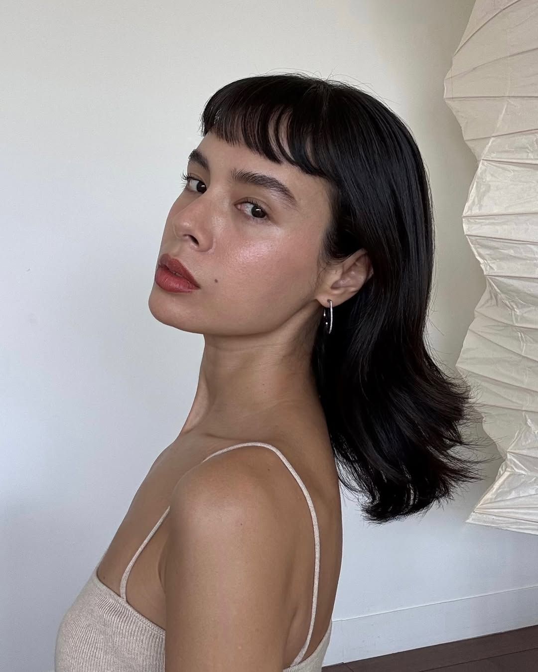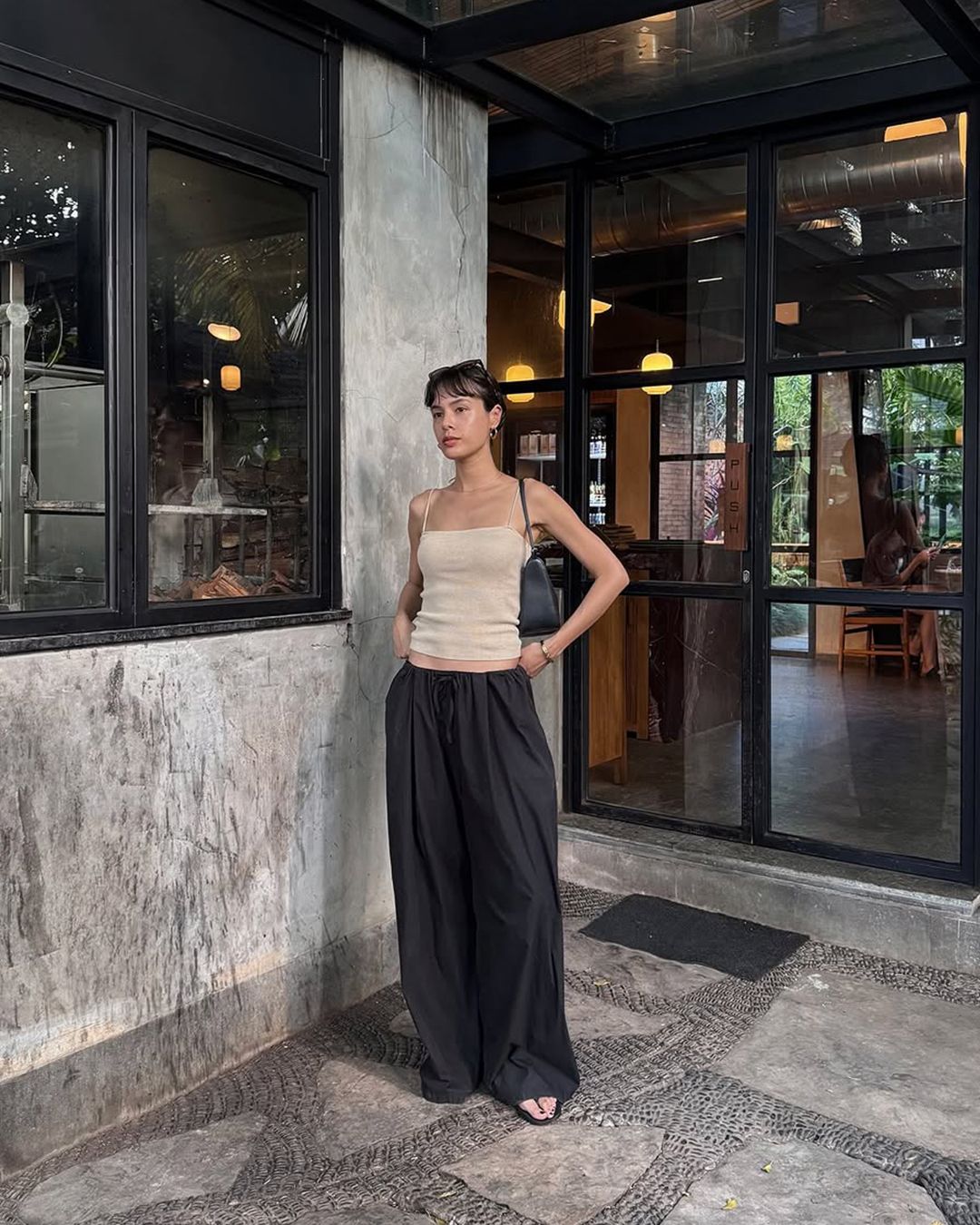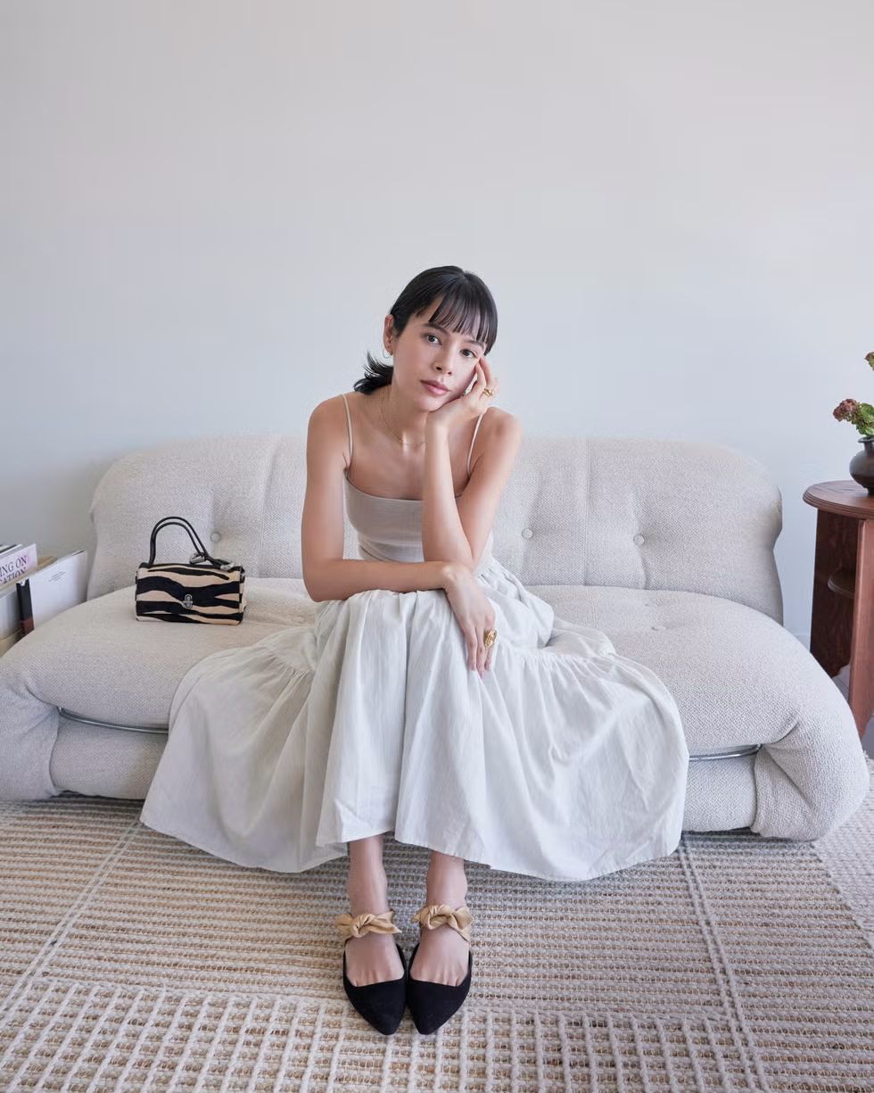 Kana is wearing size XS for Ballet Knit Tank, size S for Teacake Skirt, and size M for College Henley Top.