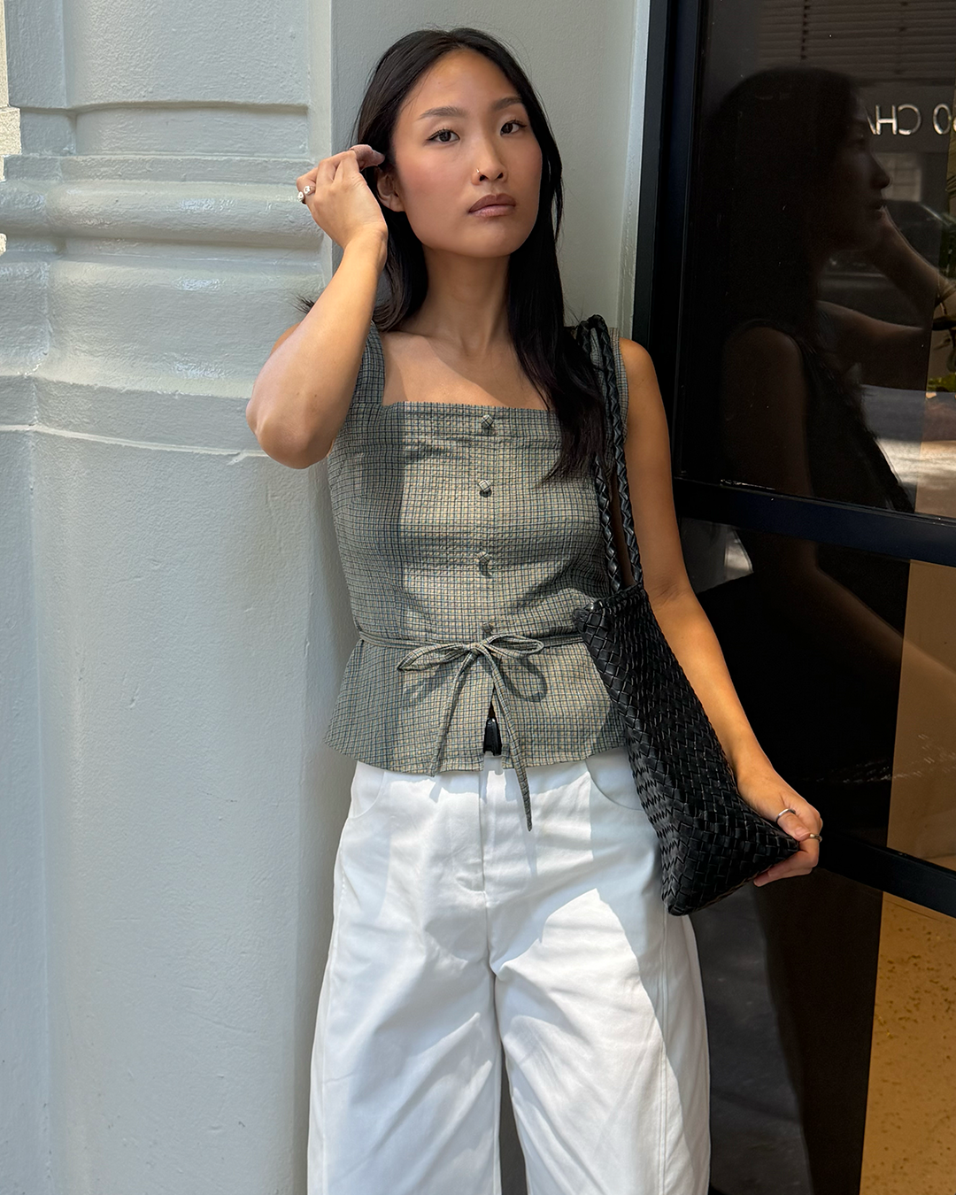 Nicki wears a size XS for Penn Blouse and size S for Paloma Trousers.